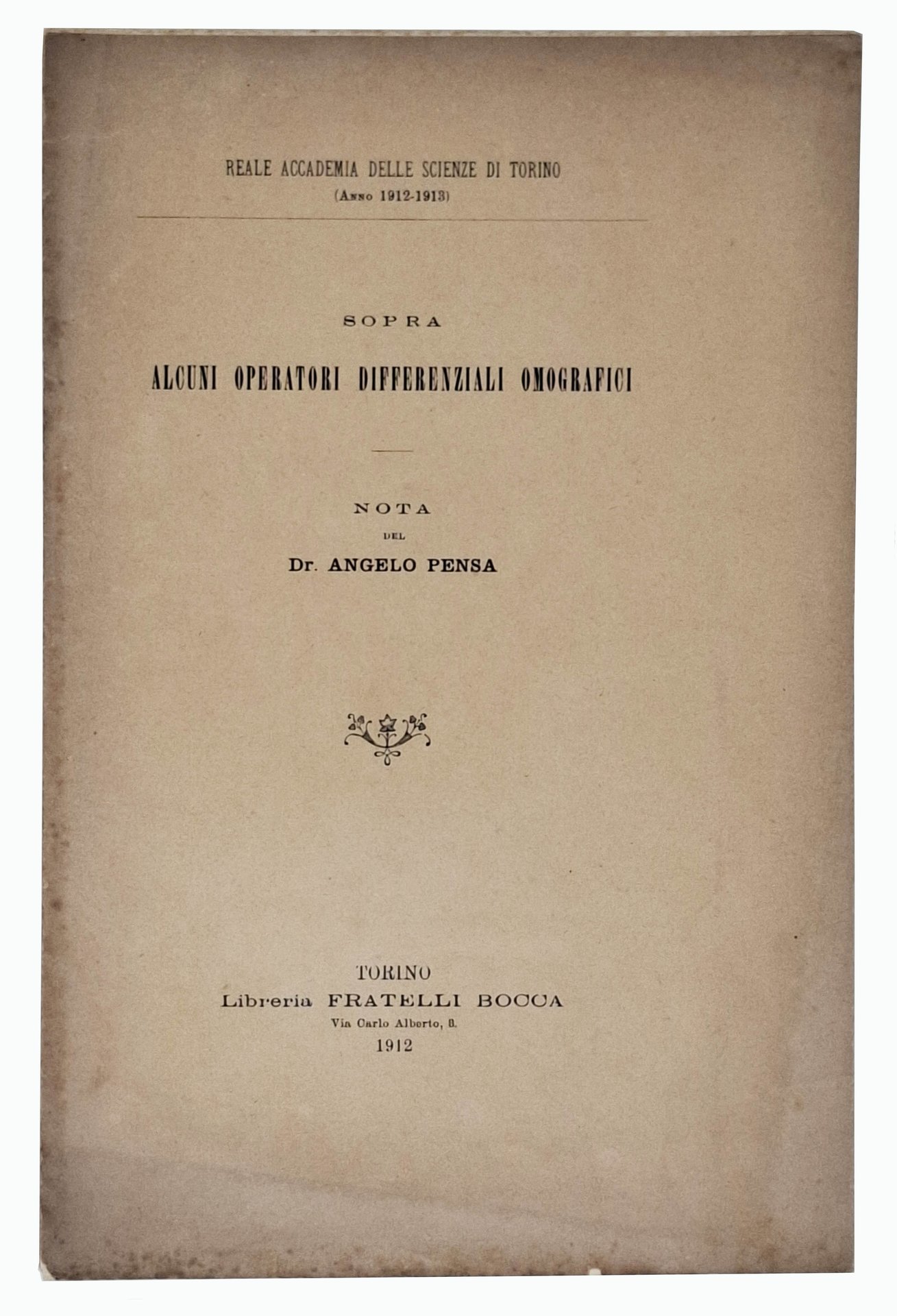 Nota di Angelo Pensa, estratta dagli Atti della R. Accademia delle Scienze di Torino: (Adunanza del 1° dicembre 1912). Pagine: 8. Stato di conservazione: qualche minuscolo taglietto sui bordo della copertina ma, nel complesso, decisamente buono. Privo di scritte, sottolineature o altri segni nel testo. In brossura.