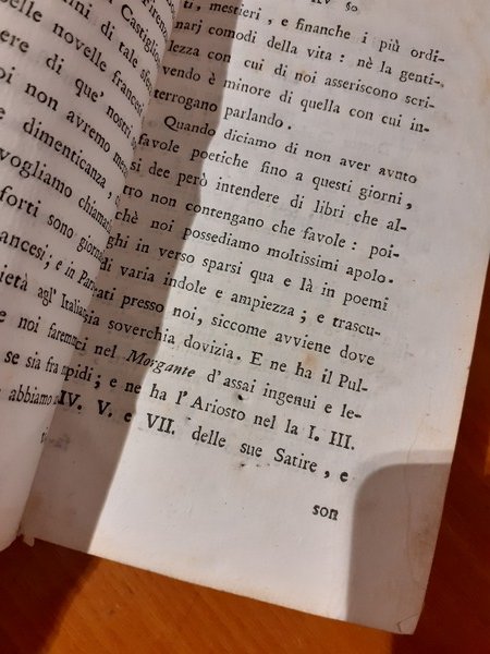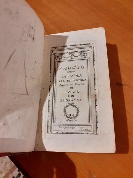 Prima edizione di questo trattato di De Giorgi Bertola, uno dei più noti letterati del Settecento, sulla favola ed i principii che devono informare tale genere letterario, stampato a Pavia nel periodo in cui l'autore era "Principe" della locale Accademia degli Affidati; la seconda parte contiene favole in versi ed epigrammi dello stesso autore.