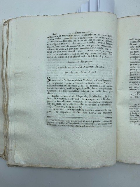 In 8 (cm 22 x 28,5), pagine numerate da 312 a 316. Brossura rifatta con carta d'epoca. Stralcio dal "Giornale di Fisica, chimica e storia naturale." di L. V. Brugnatelli, tomo III, 1810, con un articolo estratto dal "Nouveau Bulettin" del giugno 1810 sulla magnesite.