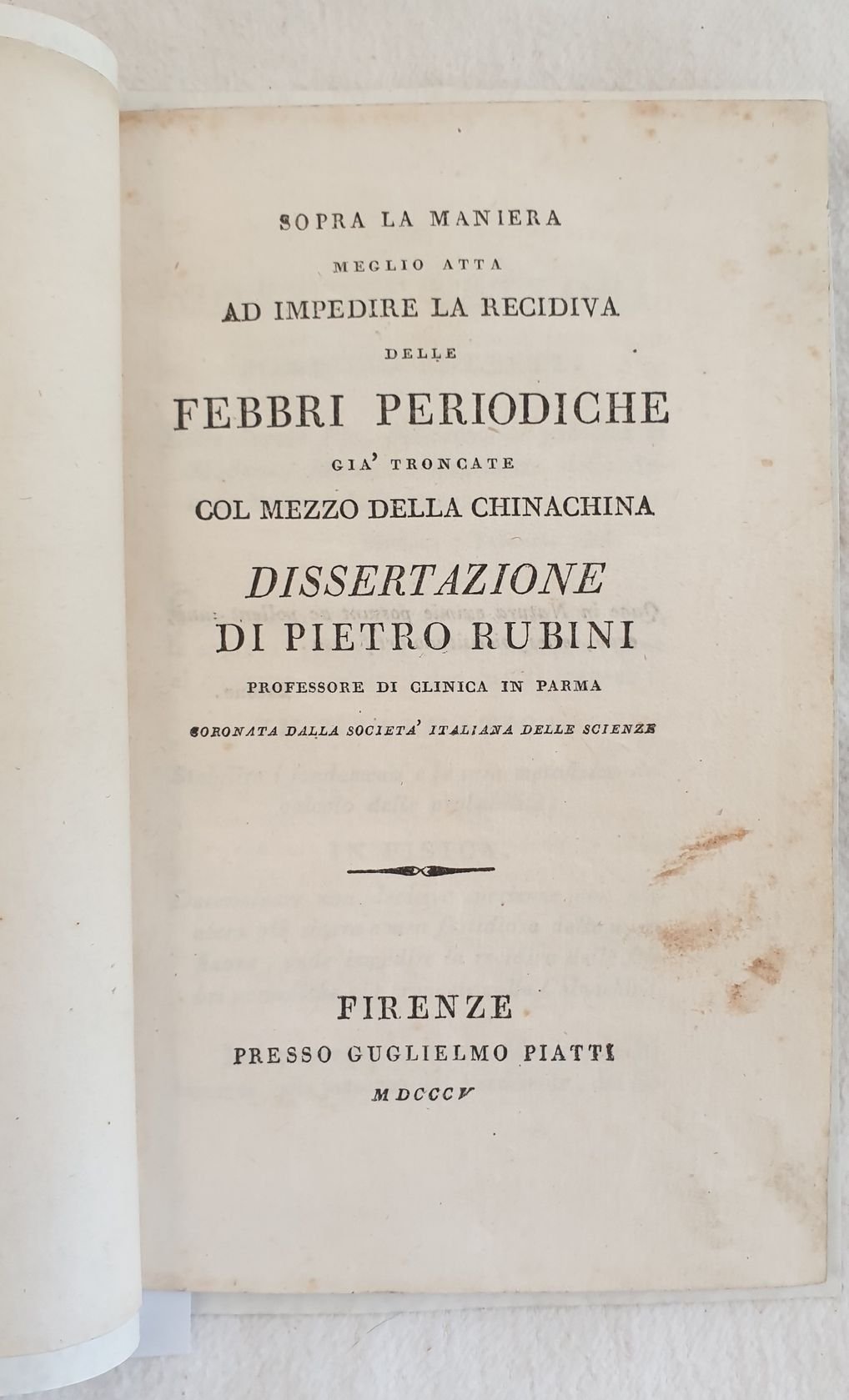 Edizione originale del 1805 di questa celebre memoria sulle febbri periodiche del medico parmigiano Pietro Rubini (1760-1819). Fu uno dei fondatori della Società Medico Chirurgica di Parma nel 1804, della quale divenne presidente e tra i principali collaboratori del Giornale Medico Chirurgico, pubblicato dal 1806 al 1813 da tale società. In ottime condizioni. Copertina protettiva decorata in ottime condizioni generali. Legatura in buone condizioni. Pagine in buone condizioni con fioriture. In 8. Dim. 19x12 cm. Pp. 63+(1). Original edition of 1805 of this famosu memory about periodical fevers by the physician from Parma Pietro Rubini (1760-1819).He was one of the establisher of Società Medico Chirurgica of Parma in 1804, of which he was presidetn and one of the most important coopeerators of Giornale Medico Chirurgico, published from 1806 to 1813. In very good conditions. Protective decorative cover in very good general conditions. Binding in good conditions. Inside pages are in good conditions with foxing. In 8. Dim. 19x12 cm. Pp. 63+(1).