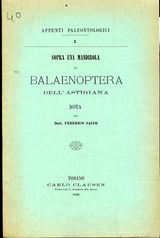 In-8°, pp. 8, brossura editoriale verde. Una tav. fototipica ripiegata f.t. Ottimo stato. Estratto dagli 'Atti della R. Accademia delle Scienze di Torino', vol. XXV, adunanza del 27 aprile 1890. Appunti paleontologici, I.