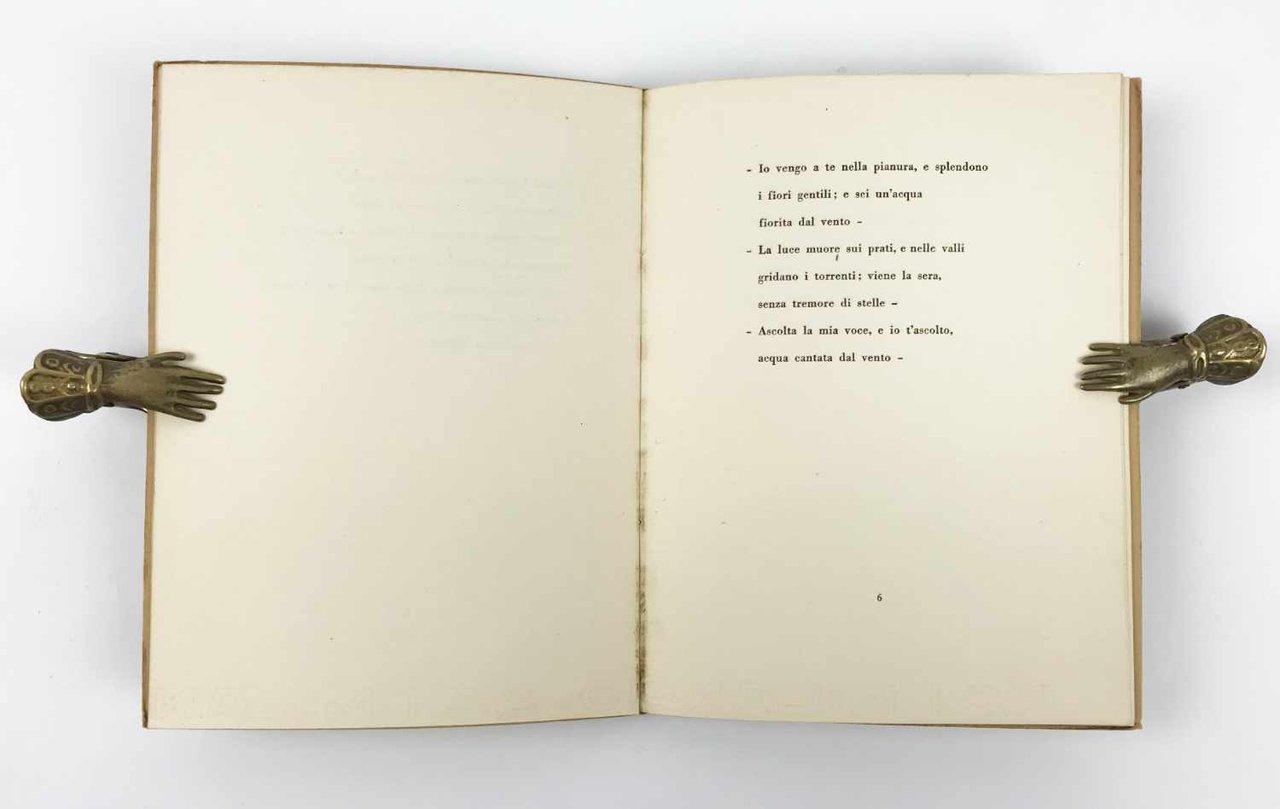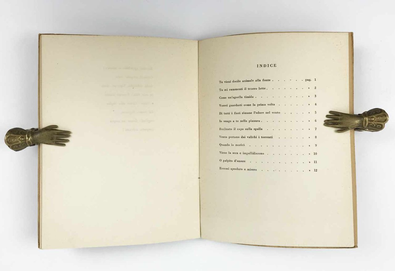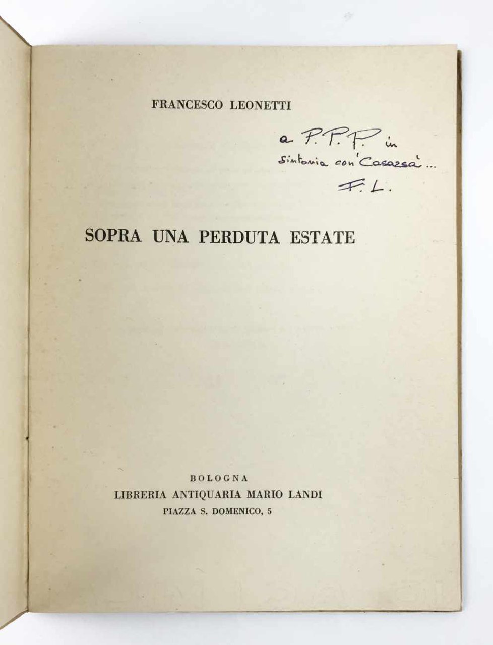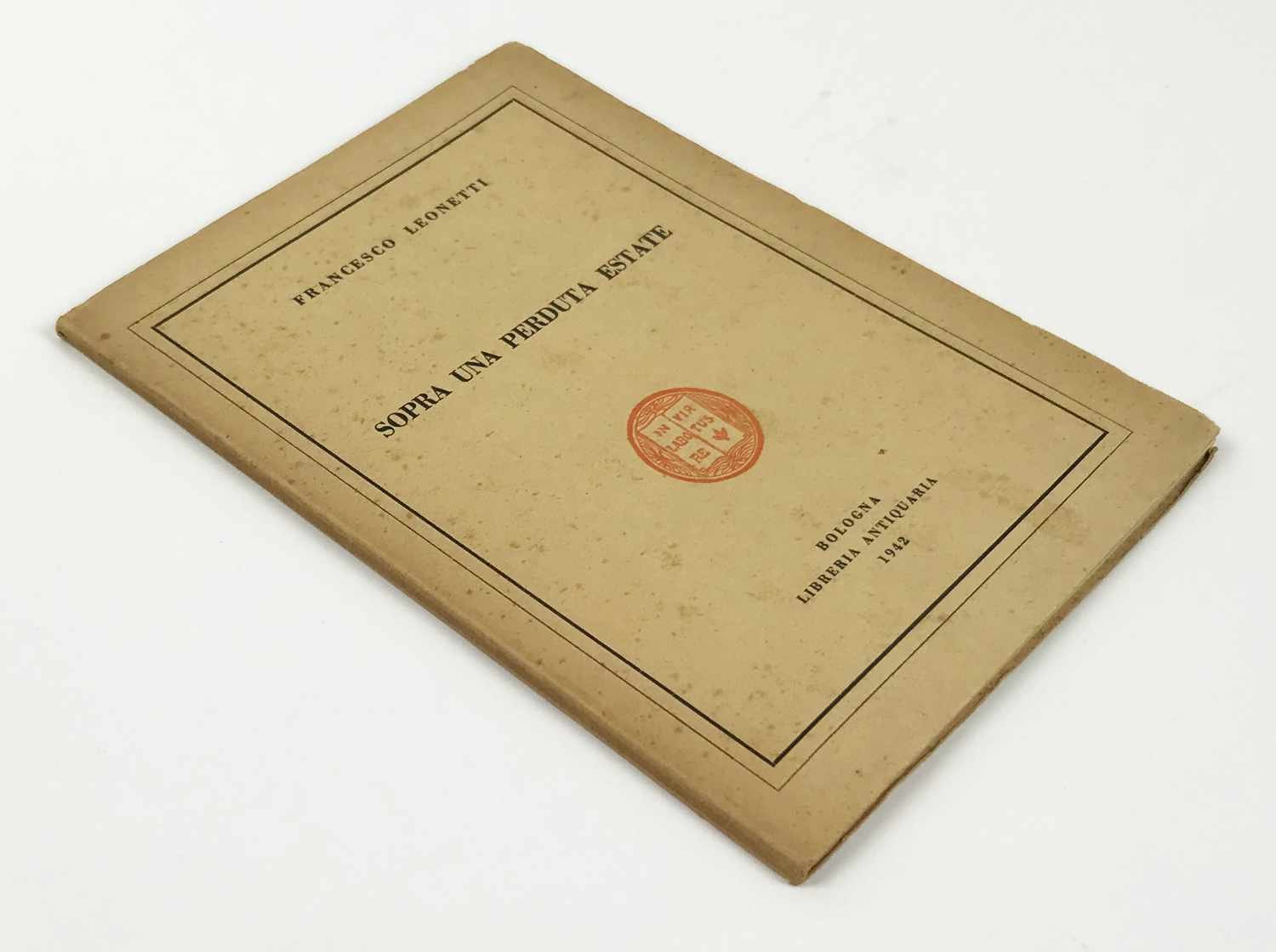 LIBROPrima edizione.Esemplare numero 94 di 300 in ottime condizioni. Raro a trovarsi in questo stato di conservazione.Opera prima di Leonetti, allora appena diciottenne, tirata in soli trecento esemplari numerati, oltre a settantacinque fuori commercio destinati alla stampa, dalla Libreria Antiquaria Mario Landi di Bologna nel giugno del 1942. Dodici componimenti fatalmente acerbi, carichi di giovanili pulsioni amorose e di nostalgici rimandi all’infanzia appena trascorsa, accompagnati e sostenuti da una natura sempre presente. Una silloge ovviamente fondamentale per comprendere la genesi della poetica di Leonetti – non a caso ripubblicata nel 2008 con la curatela di Aldo Nove – che racconta tuttavia, forse in modo ancor più significativo, il particolare fermento intellettuale che la piccola bottega di Mario Landi aiutò a crescere. Nello stesso 1942, infatti, la libreria pubblicò non soltanto l’esordio di Leonetti, ma anche quelli degli amici e compagni al Liceo Galvani di Bologna Pier Paolo Pasolini -con le sue «Poesie a Casarsa» - e Roberto Roversi - con la raccolta «Poesie». Il sigillo a un legame umano e intellettuale già forte, che un decennio dopo avrebbe dato vita alla rivista «Officina» e in seguito a percorsi a volte tra loro confliggenti eppure determinanti per l’evoluzione del panorama letterario e culturale italiano.