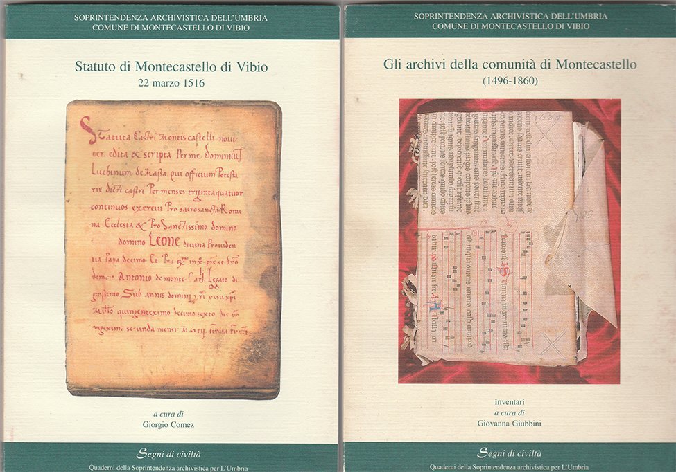 G. Gomez Statuto di Montecastello di Vibio 22 marzo 1516 G. Giubbini gli archivi della comunit‡ di Montecastello (1496-1860)inventari Perugia 1999 Due volumi racchiusi in un cofanetto in cartonato semirigido con strappi e macchie, copertina morbida editoriale con macchie e aloni di umidit‡ in particolar modo alle prime ed ultime pagine in condizioni accettabili, numero pagine 204 + 133 dimensioni cm 24 x 17 x 2,5