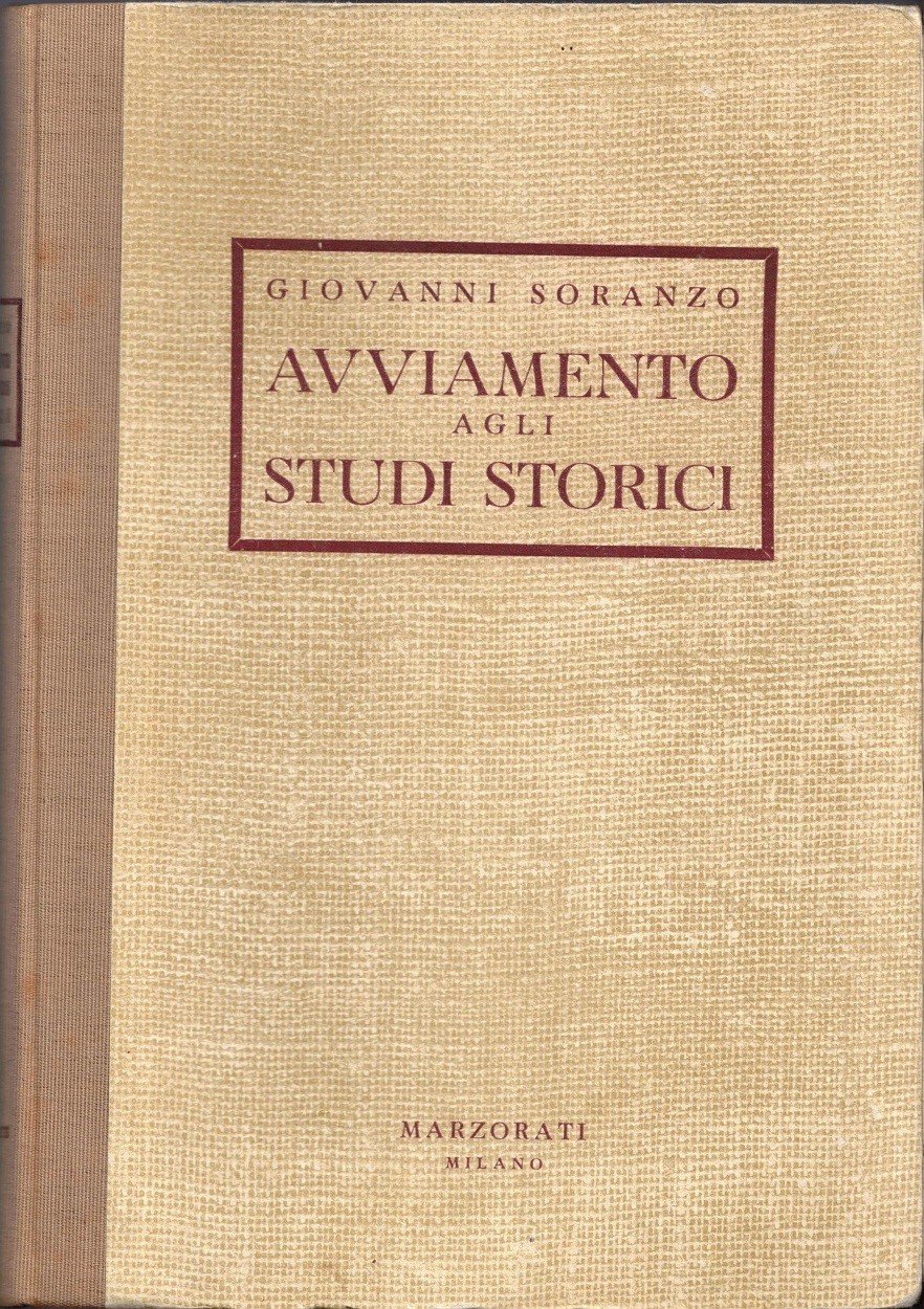Giovanni Soranzo, Avviamento agli studi storici, Dott. Carlo Marzorati Editore, Milano 1950, seconda ed., pp. VIII, 298, cm 25, legatura in mezza tela ed. con titoli al dorso e al piatto. Indice: Introduzione. Moderno concetto di storia (Concetto di storia – La storia è scienza o è arte?) – Parte prima. Metodologia storica (Concetto e partizione della metodologia – Euristica – La critica- La sintesi – L’esposizione Norme riassuntive ed esempio di procedimento nello studio storico) – Parte seconda. Cenni storici degli indirizzi storiografici – Appendici. Ordinarie tracce d’uso, minime fioriture, uniforme brunitura della carta, per il resto più che buon esemplare di piena fruibilità e con legatura solida.