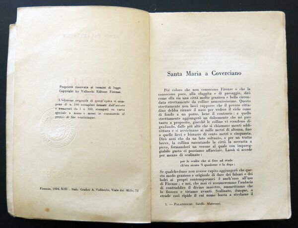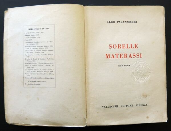 Vallecchi Editore, Firenze, 1934 – XIII. Prima originale edizione. “Prosatori italiani Contemporanei”. In 8vo, pp. 307, bross. orig. in carta. Pubblicato inizialmente sulla “Nuova Antologia”, dall’agosto all’ottobre 1934, é questo il romanzo più noto di Palazzeschi (Firenze, 1885 – Roma, 1974). Il racconto ripropone gli abituali temi della parodia dello stile di vita e della mentalità borghese, l'irrisione delle formalità e il nonsense. Ebbe vastissimo successo tanto che ne vennero tratte varie trasposizioni teatrali, nel 1943 un film diretto da Poggioli e nel 1972 uno sceneggiato televisivo. La vicenda è basata sui turbamenti e gli scompigli che un giovane nipote, sbrigliato e scioperato, provoca nell'esistenza tranquilla e solida di due anziane sorelle “cucitrici di bianco”. La conversazione è di impronta toscana e un elemento liberatorio e scanzonato rompe gli schemi tradizionali della narrativa e del racconto. Manca la sovrac., lieve ingiallimento con alcune fioriture e minime imperfezioni della brossura, nell'insieme buon esemplare.