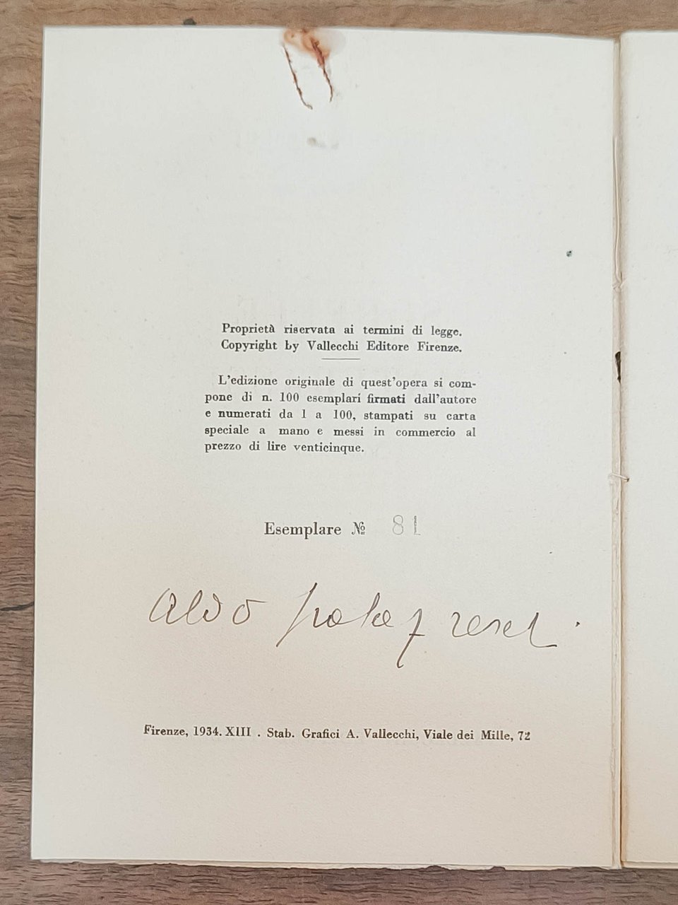 Sorelle Materassi, Firenze, Vallecchi Editore, 1934. Prima edizione. Cm 19,3. Pp. 307 (3). Brossura editoriale. Copertina leggermente sciupata, macchia di graffetta metallica alle prime sei carte. Edizione stampata in 100 esemplari con firma autografa dell'autore, esemplare n. 81. Firma autografa dell'autore.