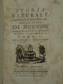 Soria Naturale generale e particolare del sig. conte Di Buffon intendente del giarino del Re, dell'Accademia Francese, e di quella delle Scienze ec. Tomo II degli animali quadrupedi.