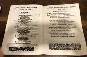 Pagg. 22 nn, bross.muta, margini rifilati, ma bell'opuscolo, con fergi xilografici, che raccoglie orazioni e odi di accademi olimpici (Bennasuti, Alfonso Capra, Francesco Barbarano, Antonio Palazzo e altri) in onore di Vincenzo Negri