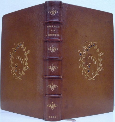 Paris, L. Conquet, 1883. In/8 reliure signée MARIUS Michel en plein maroquin havane, dos à nerfs à fleurons et titre dorés, plat à décor fleuri or et deux couleurs,dentelle intérieure, doré trois tranches, illustrations très nombreuses : 78 tirées en double dont 12 à l’eau-forte et vignettes gravées sur bois en noir, hormis la page de titre en noir et en couleur. Ouvrage tiré à 500 exemplaires ; celui-ci étant un des 150 sur grand papier du Japon.Petite fragilité au niveau du mors supérieur sur 2 cm ; 2 coins supérieurs légèrement usés ; taches sur le plat supérieur. Hector Giacomelli, né à Paris en 1822 et mort à Menton en 1904, aquarelliste, graveur et illustrateur français, connu surtout pour ses peintures d'oiseaux. La reliure, d’un travail très soigné, est très représentative du travail de Michel Marius, avec Les décors floraux délicats qui on fait sa renommée, créant pour chaque livre un nouveau décor , particulièrement adapté pour le présent ouvrage. Monod 10648.