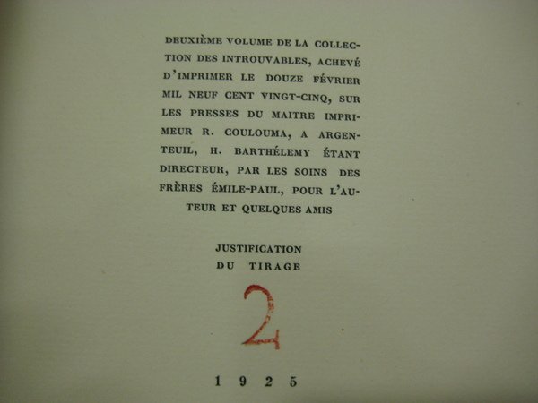 Emile Paul 1925 Pour les Frères Emile Pauln 1925. Collection Les introuvables. In-12 broché, couverture rouge rempliée ornée d’un bois gravé par Daragnès. 33 pages. Exemplaire numéro 2 justifié à l'encre rouge. Le tirage total est de 30 exemplaires, tous hors-commerce. Cachet du précédent propriétaire. Bel exemplaire. Rare