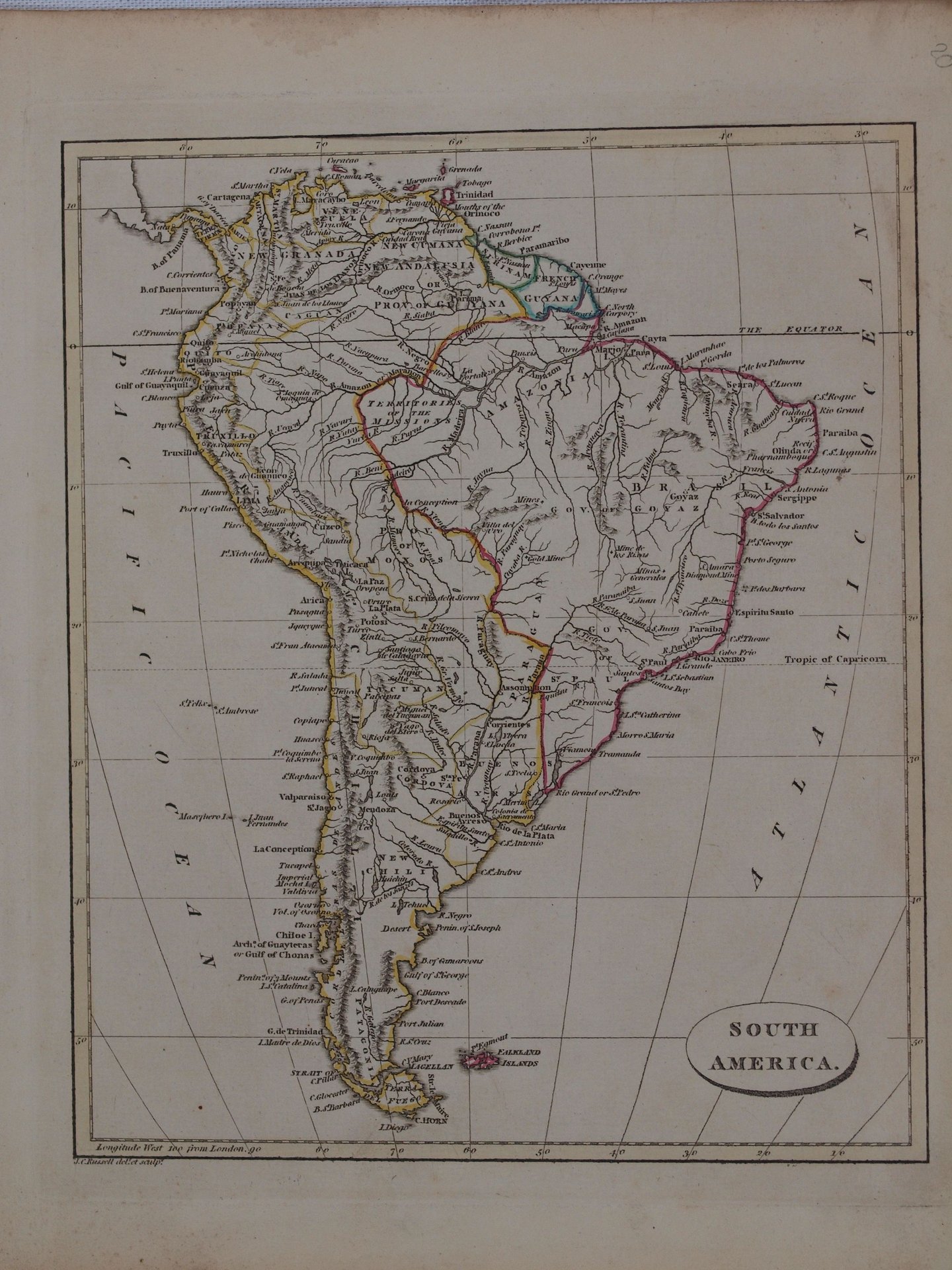Mappa del Sud America del 1815 circa incisa e disegnata da J. C. Russell colorata a mano. Indicazione anche delle Isole Falkland Autore: J. C. Russell Atlas: Ostell’s New General Atlas Data: 1815 circa Tecnica: Acquaforte Dimensioni della pagina: 28x23,5 cm Dimensioni dell'incisione: 24x19,5 cm Condizioni: Buone. Usure marginali Nice map of South America of 1815 circa engraved and drawn by J. C. Russell coloured by hand with aquarello. Falkland Islands are also depicted. Date: 1815 circa Author: J. C. Russell Atlas: Ostell’s New General Atlas Technique: Copper etching Leaf Dimension: 28x23,5 cm (11x9.3 inches) Engraving Dimension: 24x19,5 cm (9.4x7.7 inches) Conditions: Good conditions. Some worn edges.