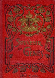 Album leporello in-16° in legatura editoriale in percallina rossa con stemma di Genova in oro entro bordura floreale e vegetale egualmente in oro. 30 vedute fotografiche ripiegate a fisarmonica. Pianta di Genova a colori al contropiatto posteriore. Ottimo stato.