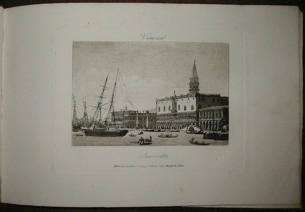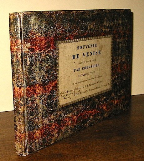 8vo oblungo (cm. 15x23), 38 tavv. incise su rame all’acquatinta (una pianta e 37 vedute della città di Venezia.) Cartonato coevo policromo con titolo a stampa su tassello cartaceo al piatto anteriore. Firmetta di appartenenza (datata 1834) sulla prima carta bianca. Esemplare in ottimo stato di conservazione. Raro.
