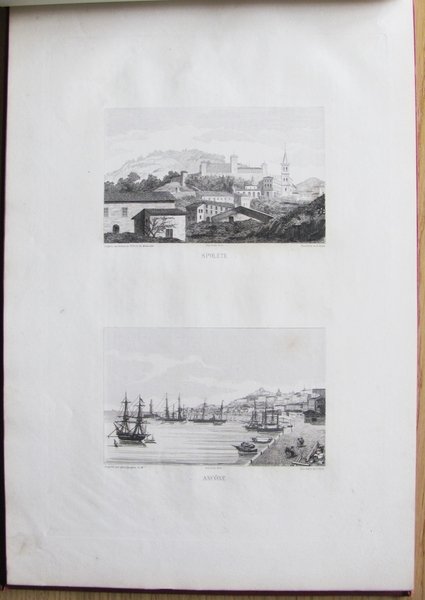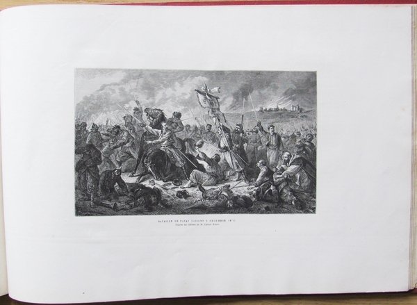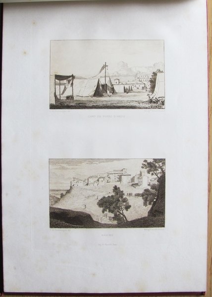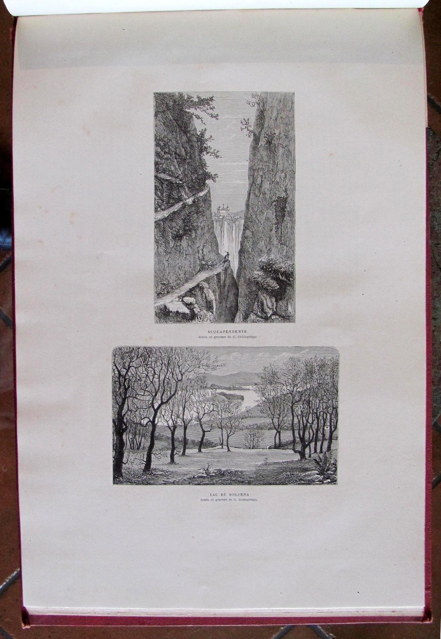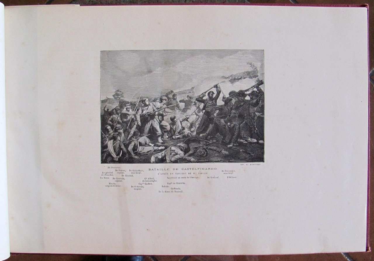 45 tavole f.t. con incisioni in b/n o in tinta, inclusa 1 a colori, di cui 16 raffiguranti 30 diversi paesi del Lazio (tra i quai Spoleto e Ancona), tutte località dove si sono svolte alcune battaglie dei Zuavi Pontifici. 46x31; pp.66 + le tav. Tela editoriale con titoli in oro al piatto e stemmi impressi a secco alle copertine. Leggere fioriture del tempo a qualche pagina. Dedica, probabilmente autografa dell'autore, alla prima pagina bianca. Splendido e Raro esemplare in Ottimo stato. , Molto buono (Very Good)