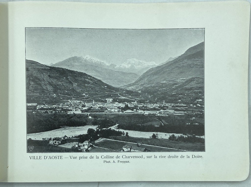 Legatura editoriale con dorso in tela muto e piatti in cartoncino telato con decoro a rilievo, titoli e fregi in verde e rosso-bruno sul piatto anteriore, formato oblungo cm 13 x 18.5, 54 carte patinate con 52 fotografie in nero (alcune con testi pubblicitari al verso), bianca la prima carta, di solo testo l'ultima. Buono stato di conservazione. Album ricordo valdostano stampato per il libraio Juste Vittaz dalla tipografia Trenkler di Lipsia, all'epoca una delle aziende dominanti in Europa per la stampa di cartoline e immagini in autotipia e litografia, la cui sigla «D.T.C.» compare in lastra in calce alle immagini che compongono il volume. Gli scatti, del fotografo aostano Adolfo Freppaz (1870 - 1945), illustrano vedute di Pont-Saint-Martin, Issime, Gressoney Saint-Jean e La Trinité, forte di Bard, Saint Vincent, Chatillon, Valtournenche, monte Cervino e lago Blu, Aosta e i suoi monumenti (sgualcita la tavola con la facciata settentrionale del Priorato di Sant'Orso), Cogne (con una tavola dedicata ai costumi femminili), Pré-Saint-Didier, La Thuile, Piccolo San Bernardo, Courmayeur e Monte Bianco, Saint-Oven, Gran San Bernardo, e molti castelli della valle: Issogne, Verrès, Fenis, Sarre, Aymavilles, Saint-Pierre. Al verso di alcune tavole annunci promozionali di alberghi, ristoranti, acque minerali, spiriti e servizi vari, con fregi decorativi di gusto liberty.