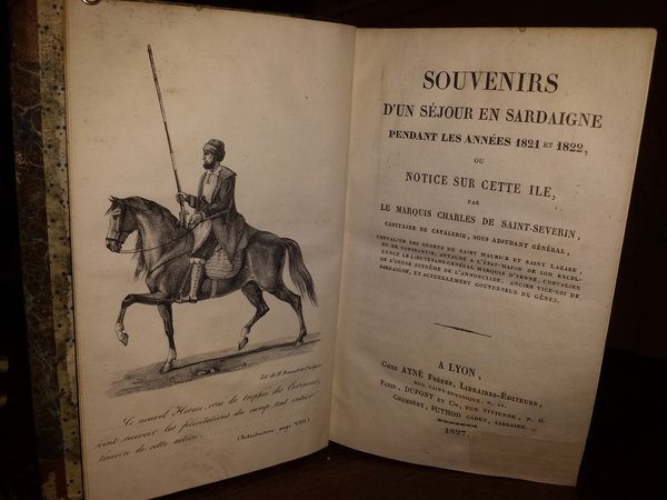 In-8 (19,5 cm) (1) c. (di tavola in antiporta) (2) XVI (2) c. (di tavole incise) 290 (4). Mezza pelle, piatti rivestiti in carta marmorizzata. Tassello, caratteri e fregi dorati al dorso. Contropiatti rivestiti di carta decorata. Titolo dell'occhietto: Souvenires d'un séjour en Sardaigne. Tavole disegnate e incise da H. Brunet. Trattato geografico storico sulla Sardegna scritta dal marchese Saint-Severin, nei due anni in cui vi ha risieduto. Rettangolino di carta incollato all'angolo inferiore bianco del frontespizio per coprire scritta o timbro. Per il resto ottimo esemplare. French language. Lingua francese