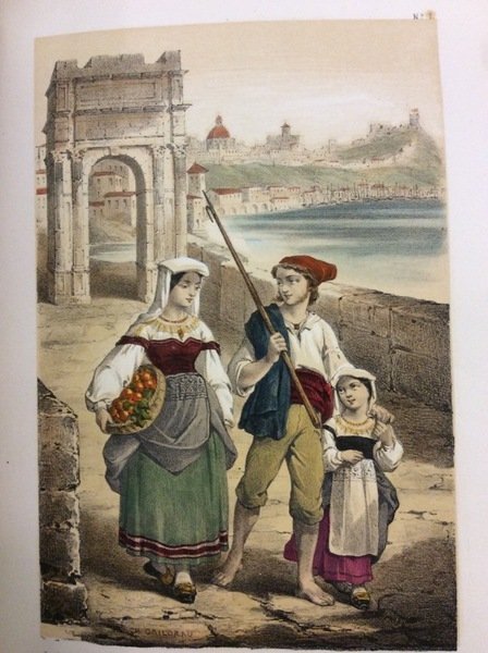 In-8 gr. (mm. 274x180), mz. marocchino rosso (piccolo spacco a una cerniera), dorso a cordoni con decorazioni e titolo oro, tagli dorati, pp. 312, illustrato fuori testo da 4 bellissime tavole animate, in litografia a colori, che raffigurano: Ferrare - Ancone, Arc de Trajan - Florence, Place du Grand Duc - Livourne. In questa interessante opera: mise en scène de Ferrare, Bologne, Ravenne, Rimini, Ancone, Lorette, Sienne, Florence, Pise, Lucques, Livourne et Nice, etc. - Prosopographie des villes étrusques: Perugia, Clusium. Cortona, Arretium, Velathri, Tarquinies, Populanie, Vétulonie, Fiesole, Pistoia, etc. - Prodiges de l'art et de la nature. Souvenirs historiques, menus-propos et causeries sur les Adelards, les d'Este, les Da Polenta, les Malatesta, les Montefeltro, de La Rovère, les Médicis, les Pazzi, les Strozzi, etc.. Esemplare ben conservato.