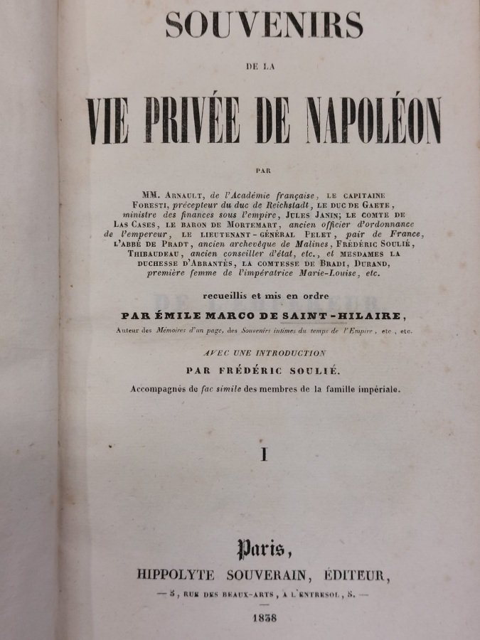 <span style="font-style: normal;">2 volumi in 1 in-16° (cm. 19,2), legatura coeve in tutta tela con titolo e fregi impressi a secco al dorso (alcune tracce d'uso), tagli spruzzati in blu; pp. [2] 403 [1b], 359 [1b], 4 in stato molto buono (lievi fioriture sparse). Tomo I e II con l'antologia dei ricordi della vita privata di Napoleone; con 2 facsimili di manoscritto fuori testo. In fine: </span><i>Chroniques de la Marine Francaise. -1789 à 1815- D'apres les documens officiels et le notes et communications des hommes de mer contemporains</i>, Fulgence Girard et Jules Lecomte, dello stesso editore. Antica nota di appartenenza manoscritta al risguardo. Buon esemplare. (NB6)