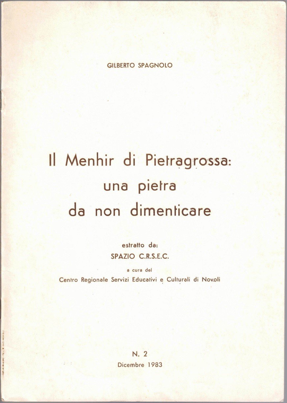 Gilberto Spagnolo, Il Menhir di Pietragrossa: una pietra da non dimenticare, s.n., s.l. s.d. (ma 1983), pp. 33-40, ill. b.n., cm 24, pubblicazione rilegata a punto metallico. Estratto da: Spazio C.R.S.E.C., a cura del Centro Regionale Servizi Educativi e Culturali di Novoli, n. 2, dicembre 1983. Minima brunitura della carta, per il resto ben conservato.