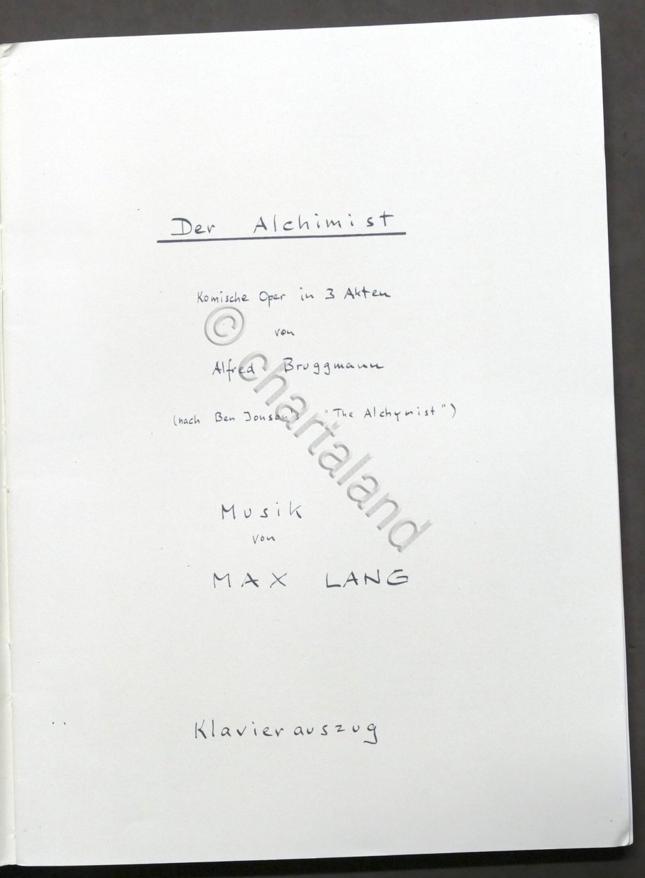 Spartito - Max Lang - Der Alchimist - Komische Oper in 3 Akten - Klavierauszug Opera comica in 3 atti di A. Bruggmann - pianoforte Pag. 257 Copertina rigida. Testo in tedesco. Condizioni molto buone.