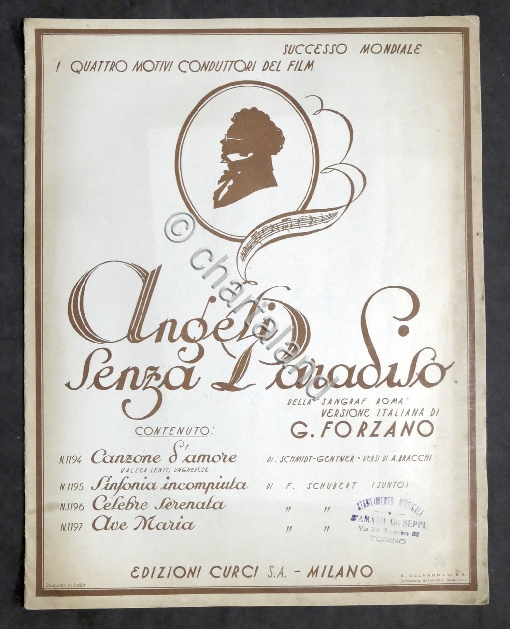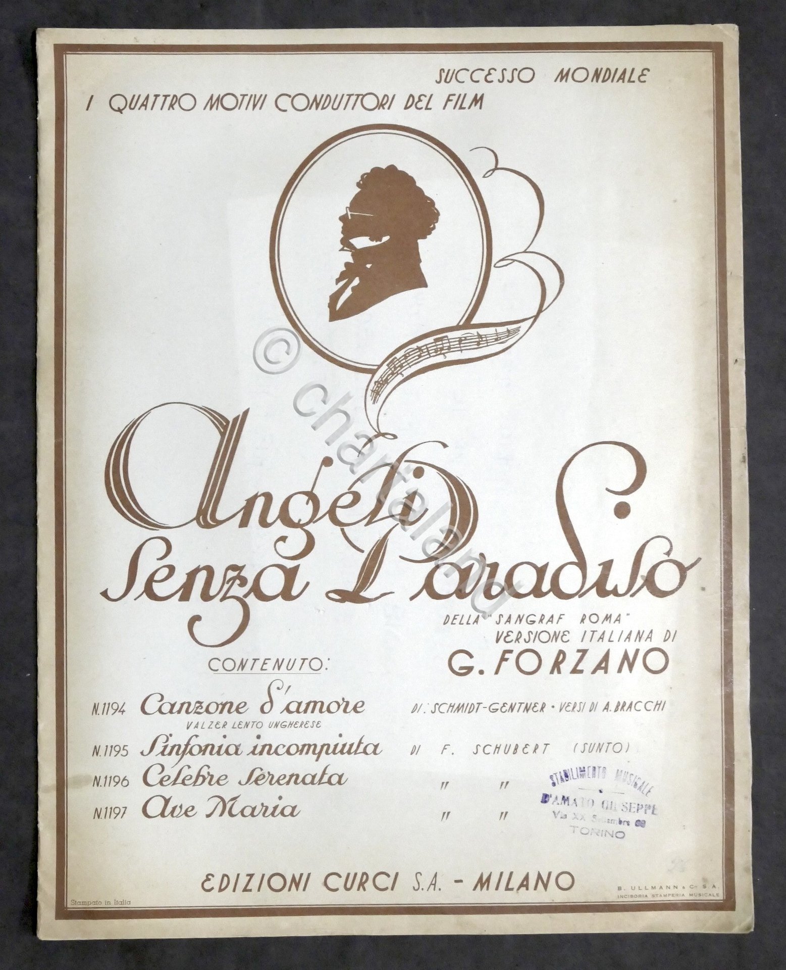 Spartito - Quattro motivi conduttori dal film Angeli senza paradiso - ed. 1934 Curci Contenuto: Canzone d'amore; Sinfonia incompiuta; Celebre serenata; Ave Maria. Pag. 8 - F.G. Condizioni buone. Piccola mancanza all'angolo superiore dell'ultima pagina.