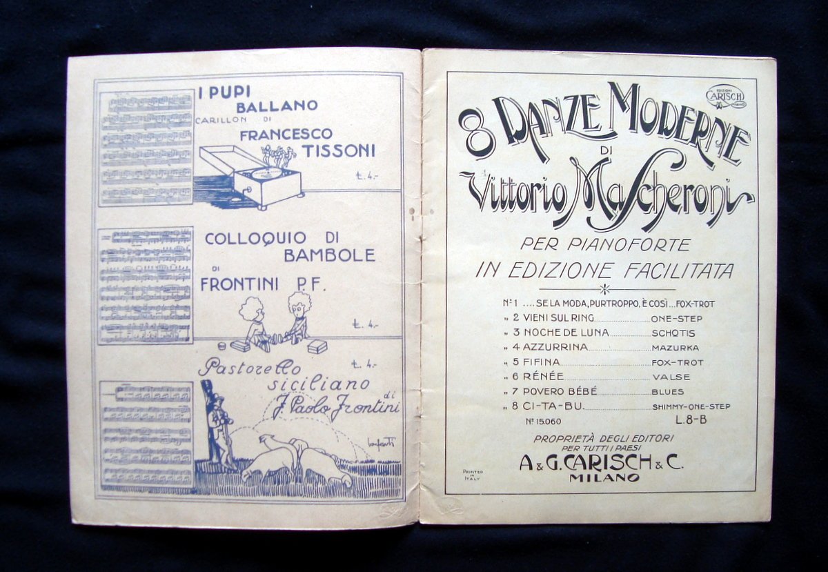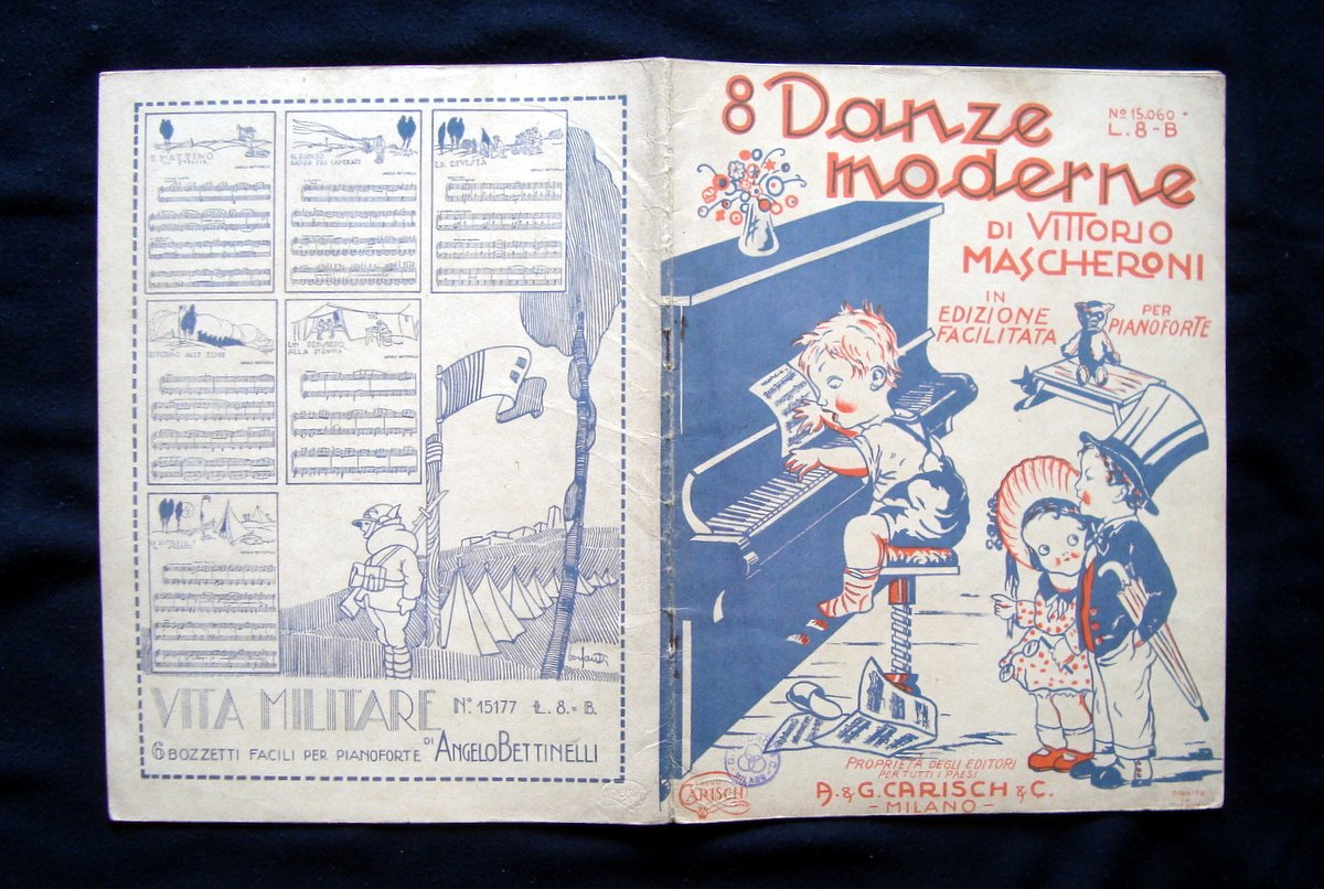 Spartito, 8 Danze Moderne di Vittorio Mascheroni in edizione facilitata per pianoforte Editore A.& G. Carisch & C., Milano, 1936, cm 31,5x24, pp. 18; br. ed ill. a colori. Timbro di proprietà alla br.ant. Condizioni di conservazione Esemplare in buone condizioni con tracce d'uso e del tempo; alcune bruniture ai margini, dorso con piccole abrasioni. SC03.D14612F blu