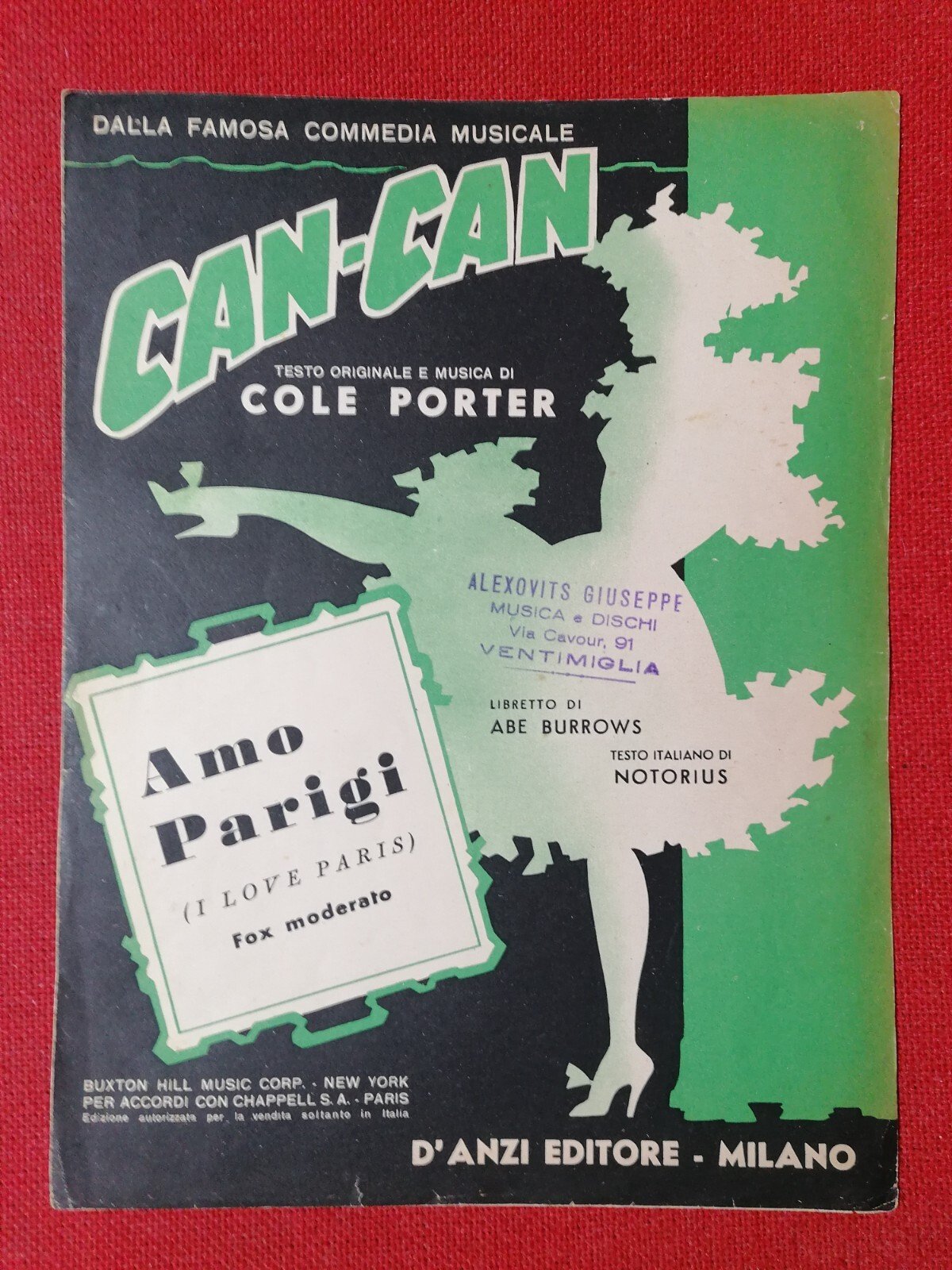 CAN CAN - Amo Parigi (I love Paris) Fox moderato Testo originale e musica di Cole Porter Libretto di Abe Burrows, testo italiano di Notorius D'Anzi editore, 1953 Spartito per canto e pianoforte in quattro facciate Discrete condizioni generali compatibilmente con l'età