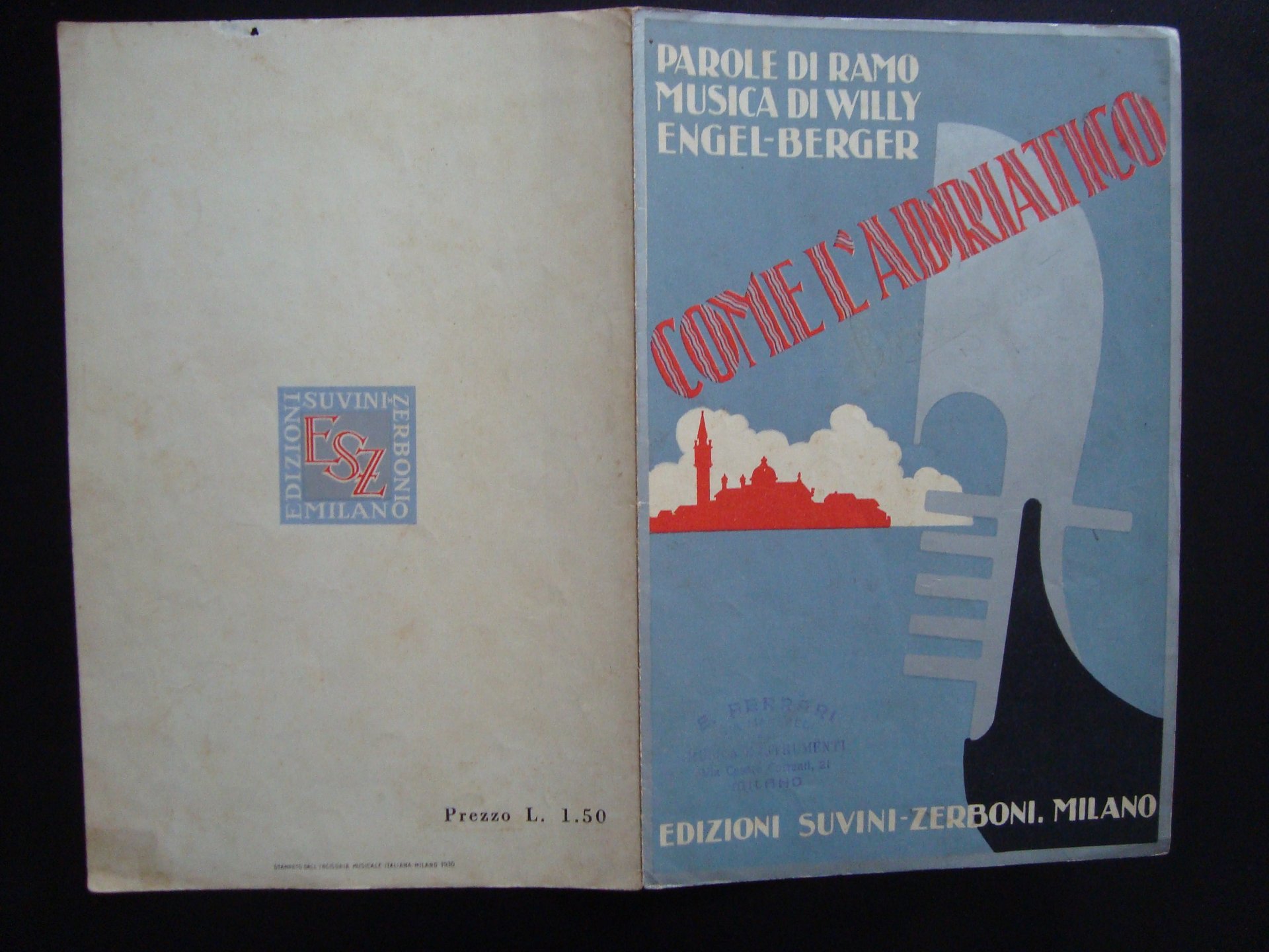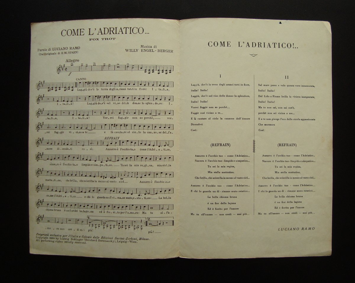 Spartito, Come l'Adriatico Parole di Luciano Ramo Musica di Willy Engel-Berger Fox Trot E.S.Z., Milano, 1930, cm 26x17, pp.4 (bifolio), ill fot. a colori. Condizioni di conservazione Esemplare in discrete condizioni con tracce d'uso e del tempo; alcune leggere bruniture e piccole macchiette, margini e angoli con minuscoli difetti, timbro di proprietà del rivenditore. SC03.D4850 BLU