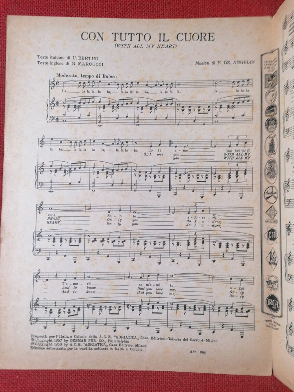 Spartito CON TUTTO IL CUORE Betty Curtis Bertini Marcucci De Angelis Adriatica