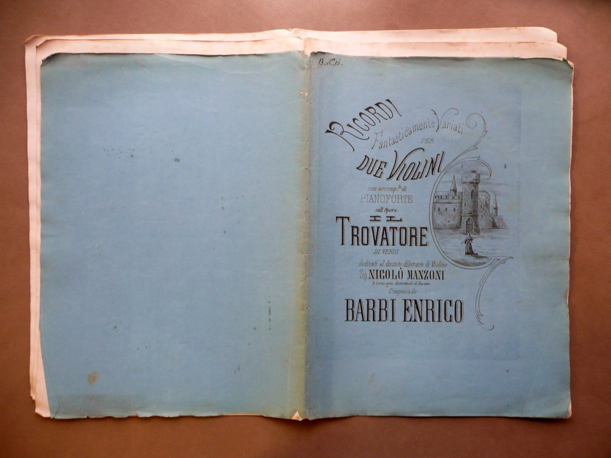 Spartito, Ricordi Fantasticamente variati per due violini Con accompagnamento di pianoforte Sull'opera Il Trovatore" di Verdi Dedicati al distinto dilettante di violino Sig. Nicolò Manzoni, R. Commissario Distrettuale di Bassano Composta da Barbi Enrico Luigi Trebbi, Bologna, s. d. (seconda metà dell'Ottocento circa); cm 36,5x27, pp. 20; brossura ed. ill. in b/n (esemplare a fogli sciolti, vedi foto e descrizione sottostante). Condizioni di conservazione Esemplare ben conservato con tracce d'uso, a fogli sciolti per mancanza delle cuciture (vedi foto); brossure con qualche minimo alone, alcuni minimi strappetti e pieghette ai margini e agli angoli; cuffia inf. con una minuscola mancanza. Interni buoni con alcune lievi bruniture; angoli con minime pieghette o accenni di pieghette. SC03.D12234 N F "