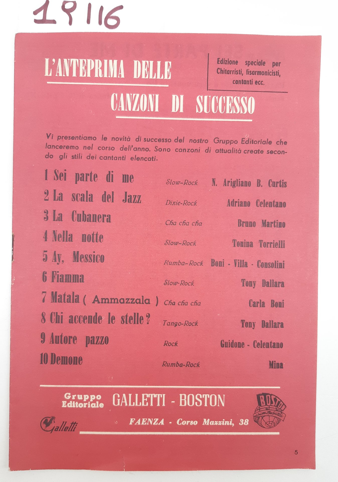 Spartito L'anteprima delle canzoni di successo Gruppo Editoriale Galletti Boston 1960