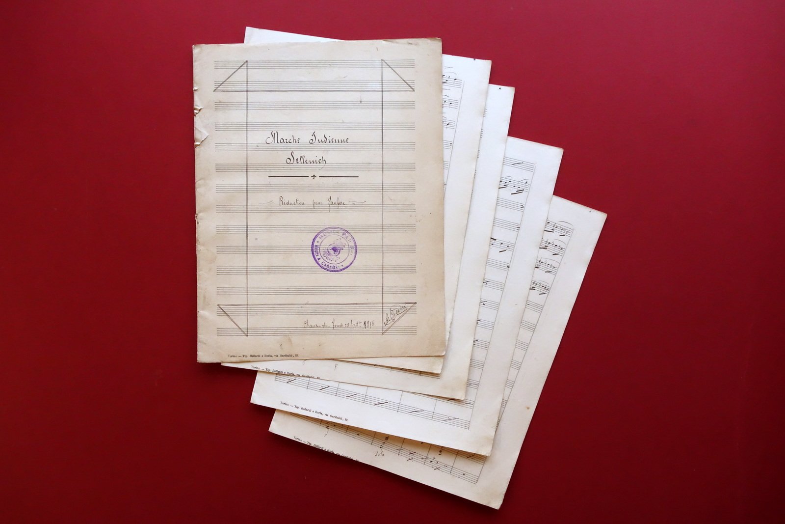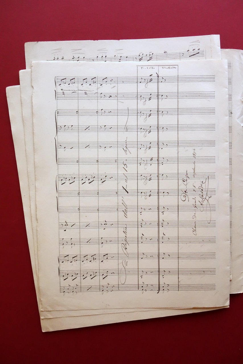 Spartito manoscritto autografo, Marche Indienne - Sellenich" riduction pour fanfare - spartito manoscritto interamente autografo di A. Casadei datato Chanse - de - Funds, 25/9/1896 firmato alla prima e all'ultima pagina con timbro - ex libris del Casadei alla prima pagina (vedi foto) 1896; cm 30,5x24; pp. 18 non num.; fogli sciolti o parzialmente sciolti per parziale mancanza delle cuciture al dorso. La partitura è interamente autografa del Casadei, che ha datato e firmato lo spartito sia alla prima pagina che al termine della musica (vedi foto); alla prima pagina presente il timbro - ex libris del Casadei. Condizioni di conservazione Buone condizioni con tracce d'uso, sciolto per mancanza delle cuciture; alcune piccole lievi bruniture e, in particolare alla prima e ultima pagina, minime tracce di sporco; al dorso un paio di piccoli strappetti in corrispondenza di una delle cuciture mancanti. SC03.D18567 N "