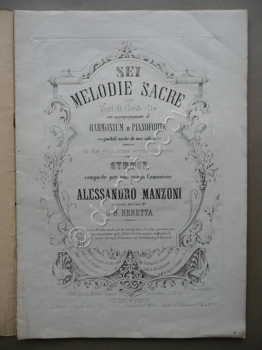 Spartito, Sei melodie sacre per voci di Contralto con accompagnamento di Harmonium o Pianoforte eseguibili anche da una sola voce ovvero da due voci senza accompagnamento poesie di Alessandro Manzoni musica del Cav. G. B. Beretta Gio. Canti, Milano, s.d. (1860-70 circa), cm 29,5x20,5, pp. 22, brossura ed. Condizioni di conservazione Esemplare in buone condizioni con tracce d'uso, margini delle brossure e dorso con alcuni piccoli strappetti (alla metà inf. del dorso è presente uno strappo di vari cm che coinvolge anche il margine interno del frontespizio, vedi foto), br. ant. con lievissima traccia di piega all'angolo sup., due angoli inf. rispettivamente con una piccolissima mancanza e una minima pieghetta. Interni buoni. Dedicatoria a stampa ad Alessandro Manzoni / che ne accettava la dedica / queste melodie / da' suoi canti inspirate / offre riconoscente e devoto / l'editore". Spartito non comune. SC03.D9343 N "