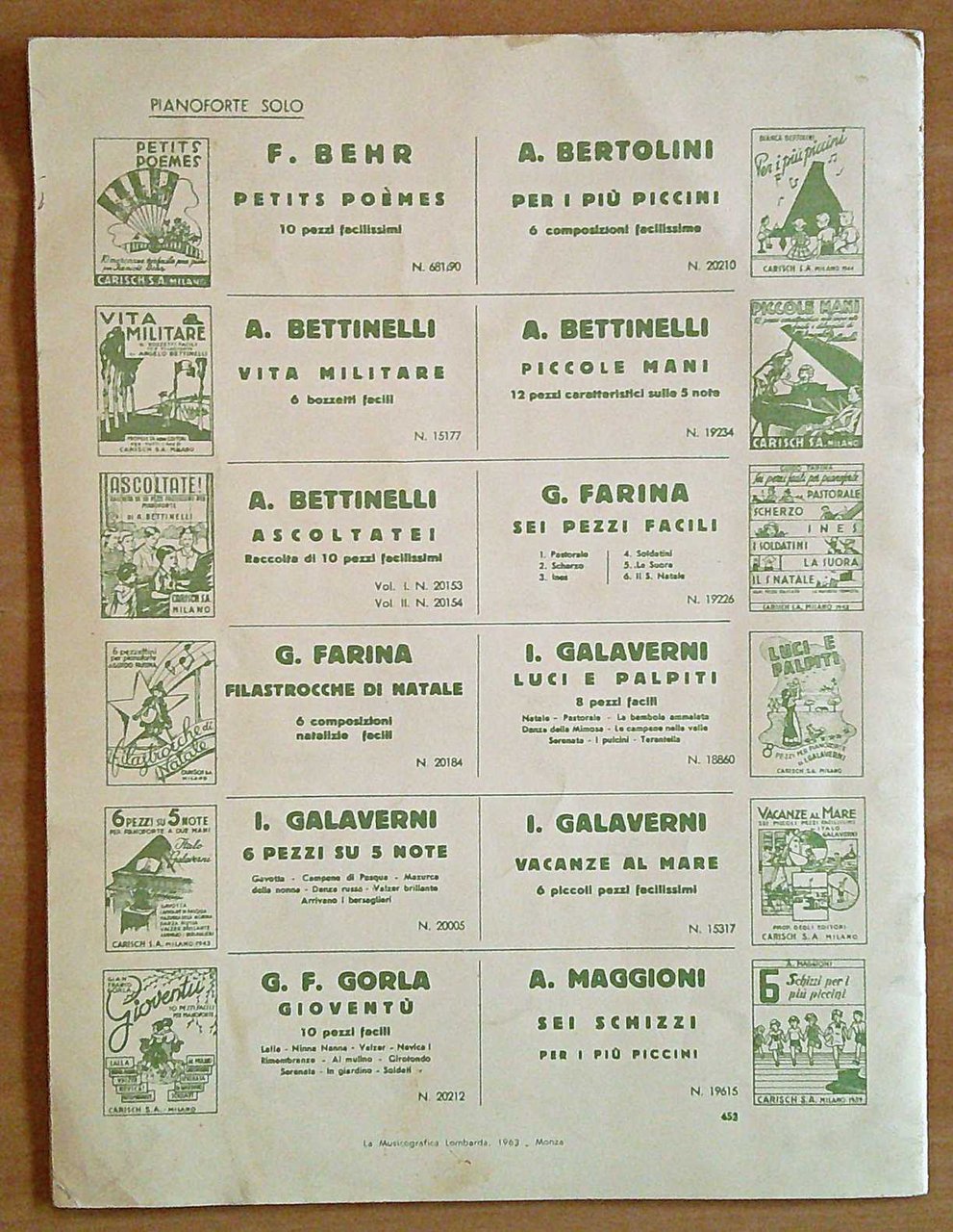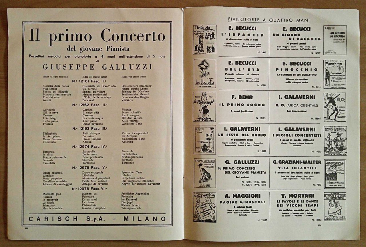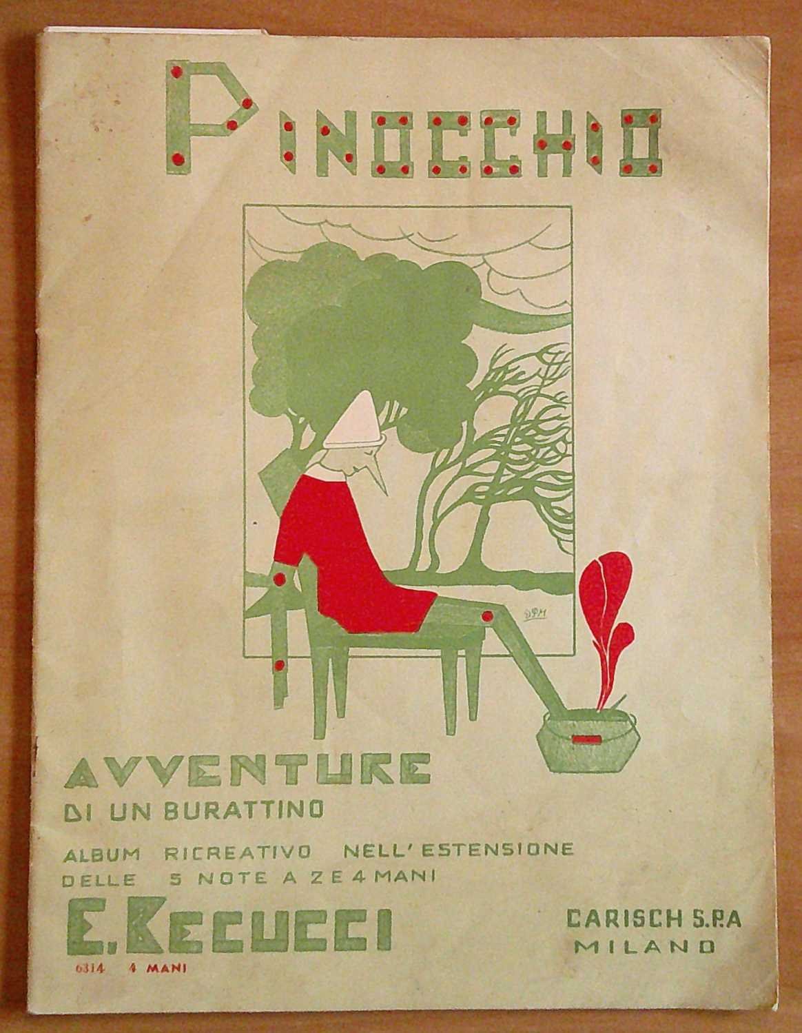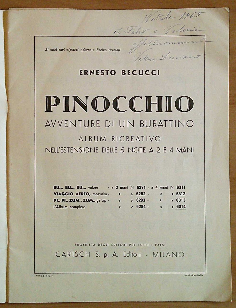 Spartito Pinocchio - Avventure di un burattino. Album ricreativo nell'estensione delle 5 note a 2 e 4 mani. Musiche di C. Becucci. Copertina siglata DPM. Ed. Carisch - Milano, 1963. Brossura editoriale con dedica del tempo al frontespizio. 23,5x31; pp.21. Ottimo Stato. , Ottimo (Fine)