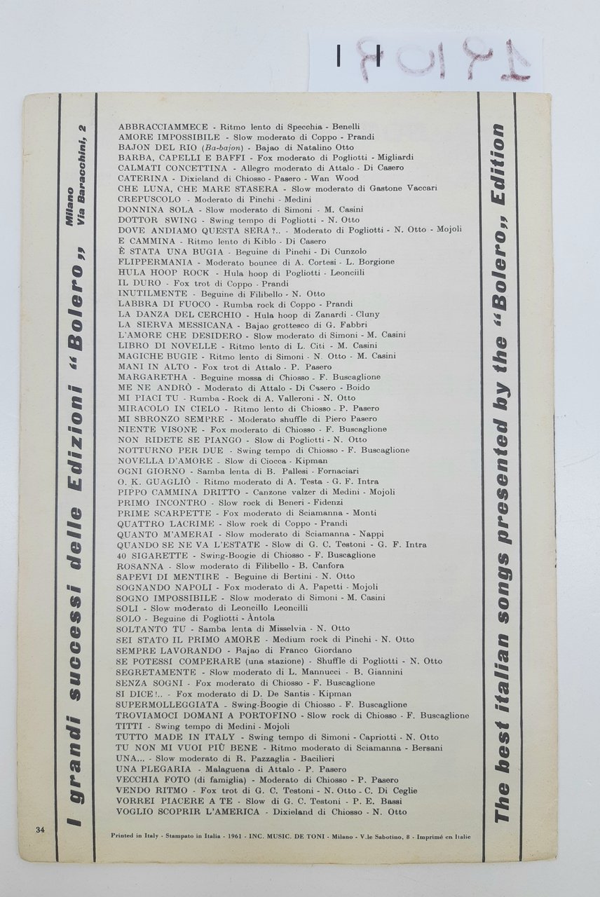 Legatura morbida editoriale in discreto stato, alcune lievi sporcizie e segni del tempo, alcune pagine interne a foglie chiusi, spartito a fogli sciolti, dimensioni centimetri 24,5 x 17,2