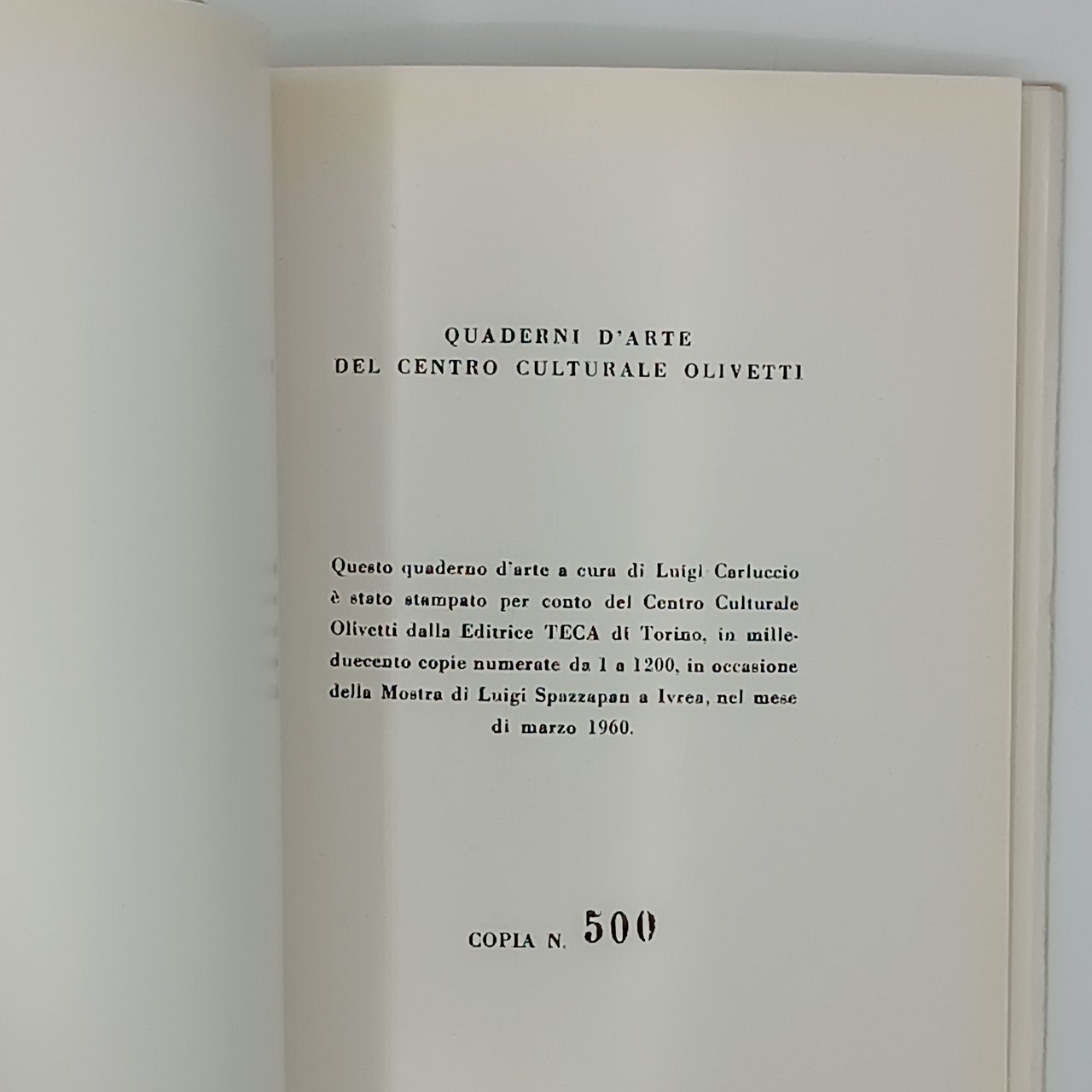 PRIMA EDIZIONE. Sono state stampate 1200 copie in occasione della Mostra di Luigi Spazzapan a Ivrea, nel mese di marzo 1960. Questa copia è la n. 500. Stato molto buono, mostra solo lievi tracce di usura sui bordi della sovvracoperta.