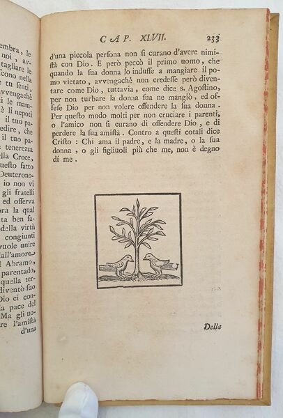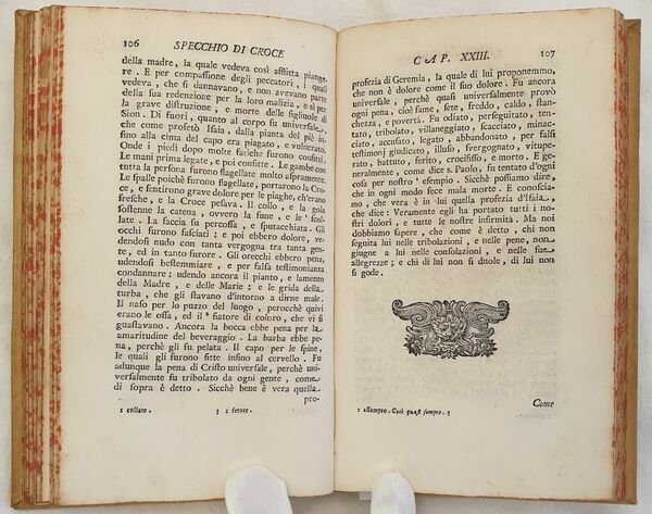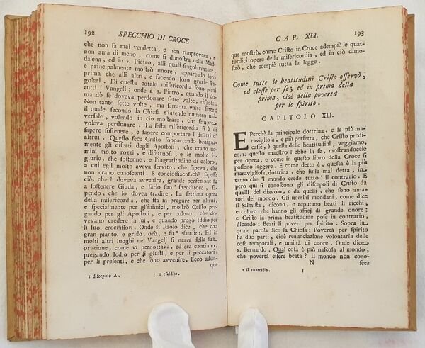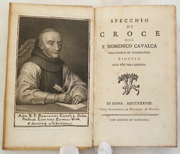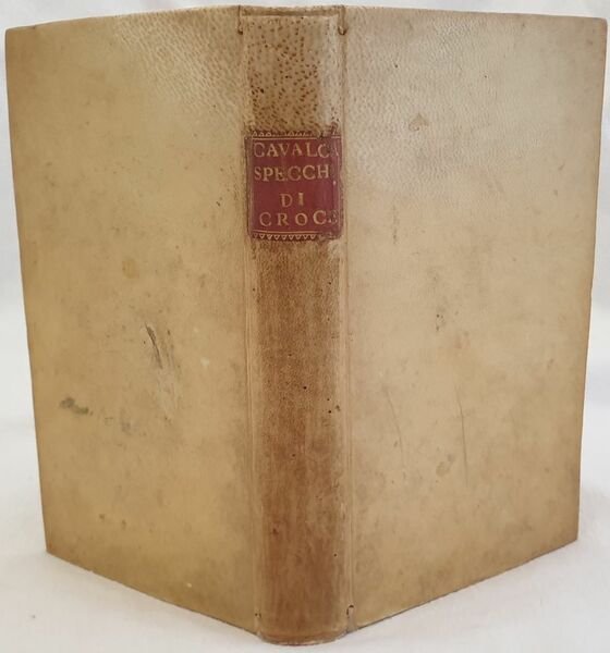 Edizione del 1738 di questa celebre opera religiosa del predicatore domenicano nato a Vicopisano Domenico Cavalca (1270-1342), docente di teologia a Pisa dove fondò il Convento di Santa Marta. "Fr. Domenico Cavalca, domenicano (1270 ca. - 1342), tra il 1320 e il 1342 ca. fu autore di scritti morali e religiosi, assai ammirati per la freschezza di lingua e candore di racconto. In lui vi è una autentica conoscenza dellesperienza ascetica e della sensibilità popolare, che gli consentono di porsi tra i maestri più sicuri e ascoltati della spiritualità medioevale. Lo dimostra in particolare lo "Specchio di Croce", la sua opera più originale e la più letta, come dimostrano i più che cento codici a noi giunti e le 38 edizioni. Il breve trattato assomiglia a un ciclo continuo di prediche per la Passione sia per l'argomento sia per il linguaggio crudamente patetico. Lo scrittore si concentra nellevocazione commossa delle pagine più drammatiche dei Vangeli, a volte col soccorso di dettagli apocrifi. E anche in questo libro non mancano rimproveri contro il clero, i monaci, i ricchi. (Cfr. Dizionario Biografico Italiani,XXII, pp. 583-84).<BR> Il nome del curatore, Giovanni Gaetano Bottari, figura nella dedica con le iniziali G.B., (cfr. Bibliografia Generale Italiana). Firma a penna alla prima carta bianca datata 1993 e antica firma datata 1798 al contropiatto anteriore. All'interno sono presenti due planches una delle quali in antiporta. La planche in antiporta è un incisione incollata con note manoscritte. Tagli marmorizzati. In ottime condizioni e completo. Copertina in piena pergamena con titolo in oro al dorso in ottime condizioni con lievi usure ai margini e dorso. Legatura in buone condizioni. Pagine in ottime condizioni con rare fioriture. In 8. Dim. 21x13 cm. Pp. (28)+248. Peso Kg. 0,478 Edition of 1738 of this famous religious work by the dominican preecher born in Vicopisano Domenico Cavalca (1270-1342), teacher of theology in Pisa where he established the convent of Santa Marta. "Fr. Domenico Cavalca, domenicano (1270 ca. - 1342), tra il 1320 e il 1342 ca. fu autore di scritti morali e religiosi, assai ammirati per la freschezza di lingua e candore di racconto. In lui vi è una autentica conoscenza dellesperienza ascetica e della sensibilità popolare, che gli consentono di porsi tra i maestri più sicuri e ascoltati della spiritualità medioevale. Lo dimostra in particolare lo "Specchio di Croce", la sua opera più originale e la più letta, come dimostrano i più che cento codici a noi giunti e le 38 edizioni. Il breve trattato assomiglia a un ciclo continuo di prediche per la Passione sia per l'argomento sia per il linguaggio crudamente patetico. Lo scrittore si concentra nellevocazione commossa delle pagine più drammatiche dei Vangeli, a volte col soccorso di dettagli apocrifi. E anche in questo libro non mancano rimproveri contro il clero, i monaci, i ricchi. (Cfr. Dizionario Biografico Italiani,XXII, pp. 583-84). Name of the curator, Giovanni Gaetano Bottari, at the end of dedication with initials G. B. (cfr. Bibliografia Generale Italiana). Firma a penna alla prima carta bianca datata 1993 e antica firma datata 1798 al contropiatto anteriore.<BR><BR>Signature ith pen in the first endpage dated 1993 and antique signature dated 1798 in the front counterplate. Inside there are two plates of which one is in the frontspice. The plate in the frontspice has been attached with and antique handwritten didascalia. Marbled external edges of pages. In very good conditions and complete Full parchment cover with golden title in the spine in very good general conditions lightly worn in the extremities. Binding in good conditions. Pages are in very good conditions with occasional foxings. In 8. Dim. 21x13 cm. Pp. (28)+248. Weight Kg. 0,478