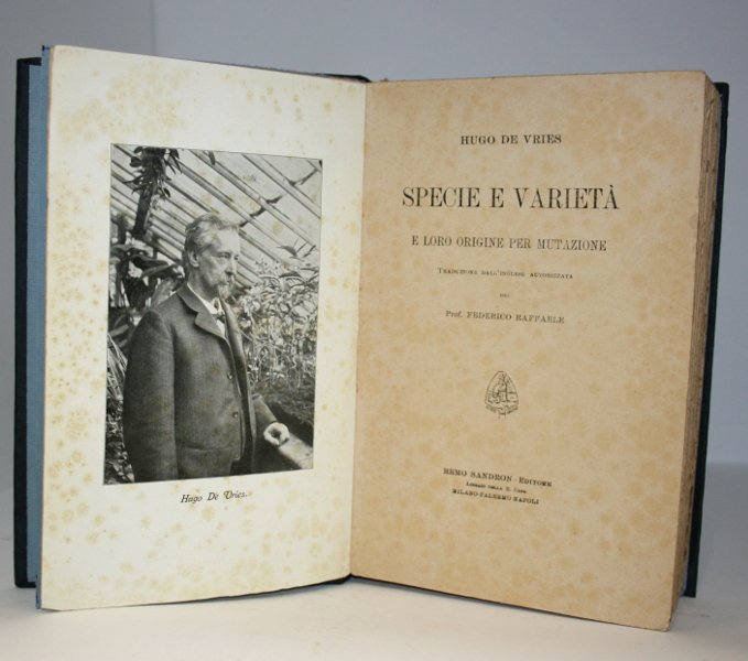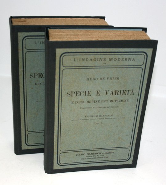 In 8vo (cm 23x15). Legatura in tela rimontata conservate le sovracoperte originali. 2 Vol. pag. 804. Una tavola (foto del De Vries). Qualche gora al frontespizio per il resto intonso in ottimo stato. - Rara edizione italiana. Anno di prefazione 1904. Data di stampa ricavata da una nota del traduttore 1906. - Importante la sua teoria sulle mutazioni spontanee e improvvise. Fu tra coloro che aprirono la via della moderna genetica.