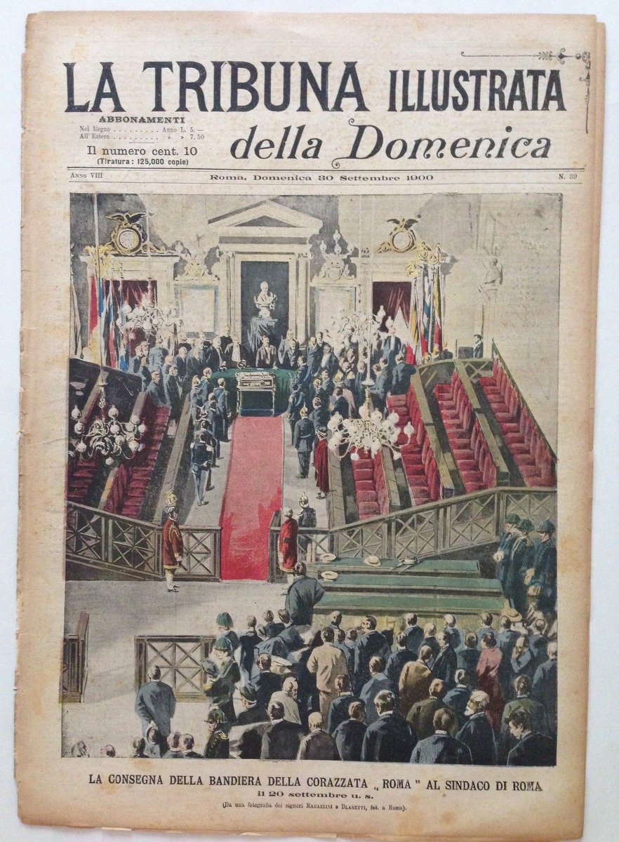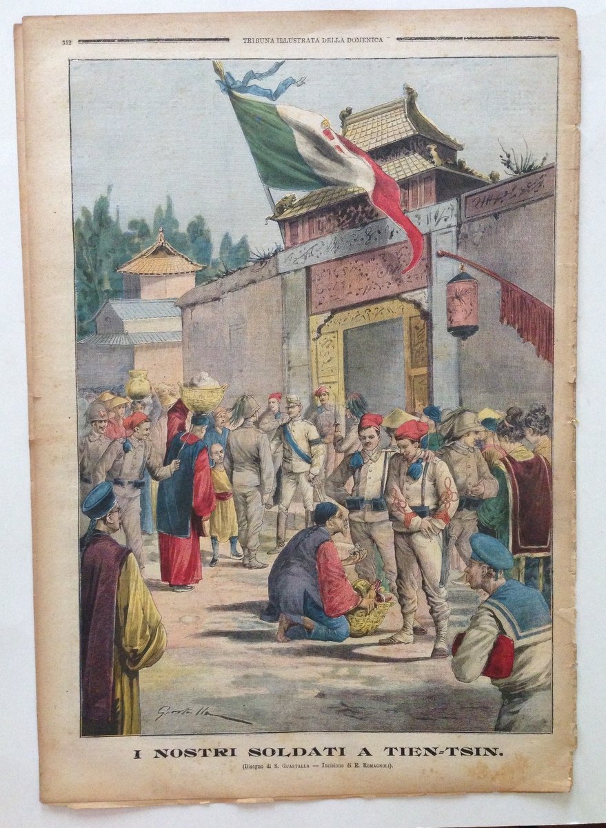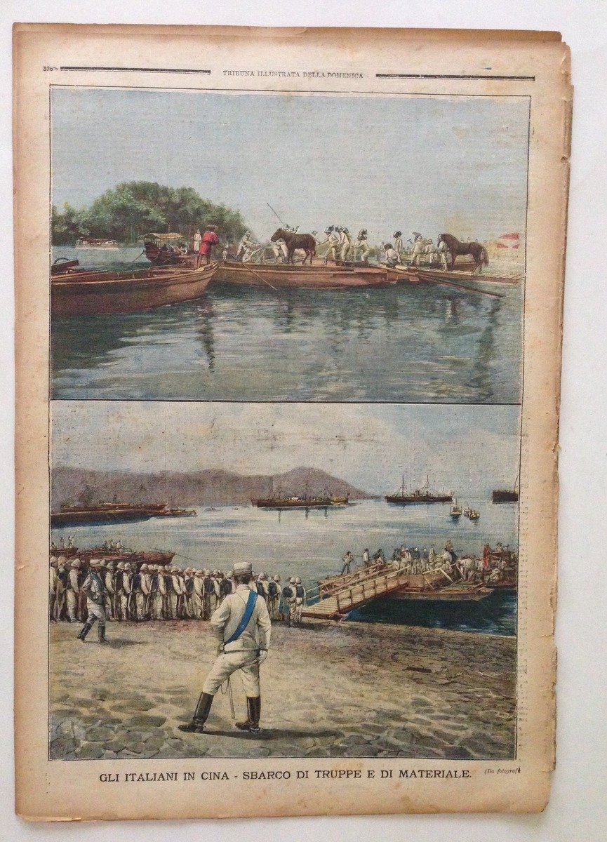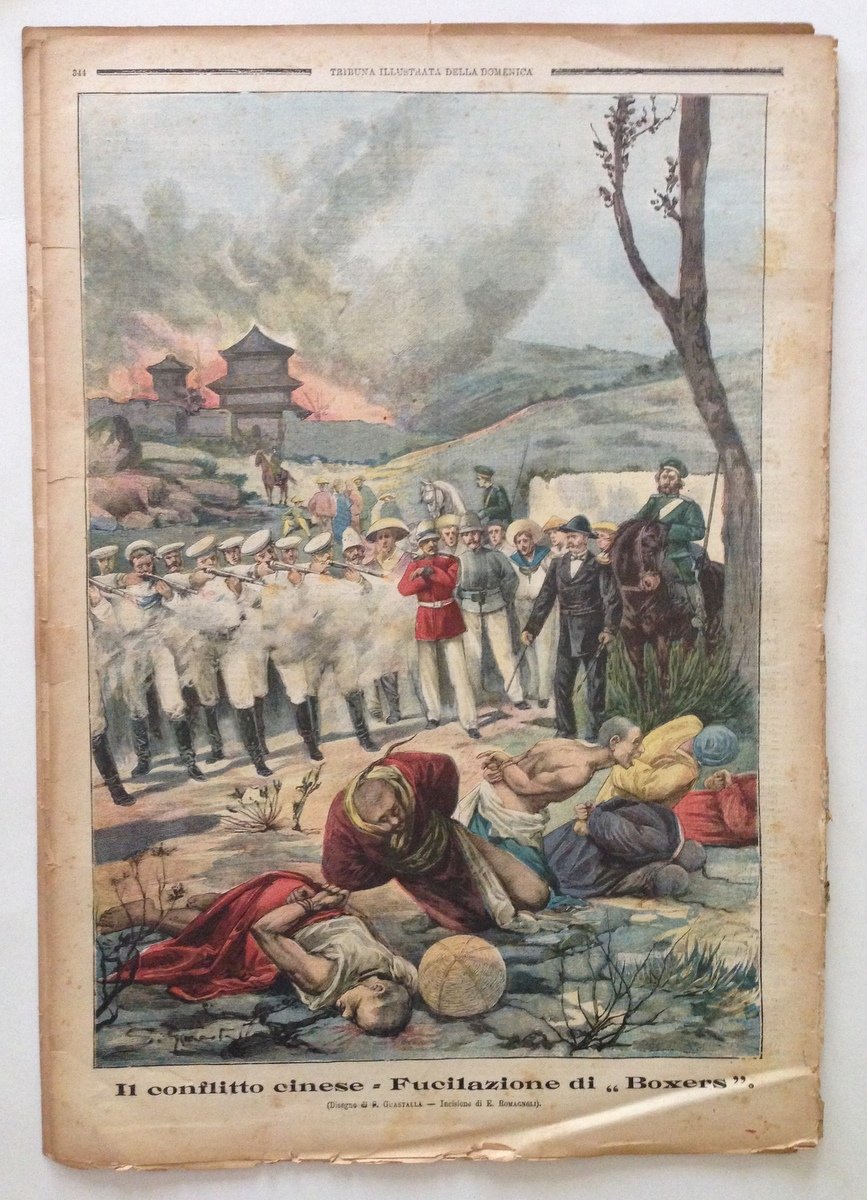 Rivista, Spedizione in Cina - Boxers" Grande illustrazione a colori alle ultime pagine de "La Tribuna Illustrata della Domenica" Anno VIII-N.39 del 30 Settembre 1900 Anno VIII-N.42 del 21 Ottobre 1900 Anno VIII-N.43 del 28 Ottobre 1900 Roma 1900, cm 43x30, pp. 8 , 8, 8 (numerazione progressiva annuale) 3 numeri con numerose ill. in b/n nel t. e con due grandi ill. a colori alla prima e all'ultima pagina, belle ultime di copertina a col. (ritoccate a mano), testata non comune con belle copertine a col. Numeri completi. Condizioni di conservazione Esemplari in buone condizioni con tracce d'uso, alcune piccole lievi bruniture; margini e angoli con qualche minima imperfezione, dorsi con alcune minuscole mancanze e parzialmente fessurati per distacco da volume rilegato. Numeri completi. SC03.D4631 F MT "
