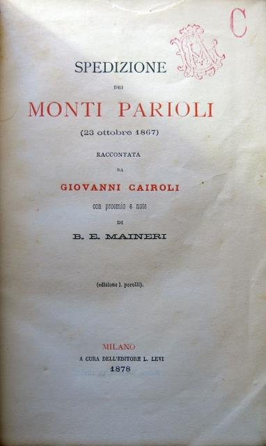 Con proemio e note di B. E. Maineri. A cura dell'Editore L. Levi, Milano, 1878. Edizione 1 Perelli. Dedica a stampa dell'editore a Benedetto Cairoli. In 12esimo, puntasecca in antip. con ritratto del Cairoli pp. 187 + 4 editoriali, leg. coeva muta (ma forse non la originale che si prevedeva in brossura), testo piccolo ed elgante, marginoso. Raro resoconto del tentativo di presa di Roma detta dei Monti Parioli nel quale morì Enrico Cairoli. Giovanni, in quell'occasione, venne arrestato e, durante la detenzione scrisse questa memoria. L'anno dopo anche lui morì in seguito alle ferite riportate nel fallito tentativo. Elegante timbretto di privata appartenenza al frontespizio. Alcuni difetti del tempo (sciolti i primi due fogli dopo il front.) ma buona conservazione.