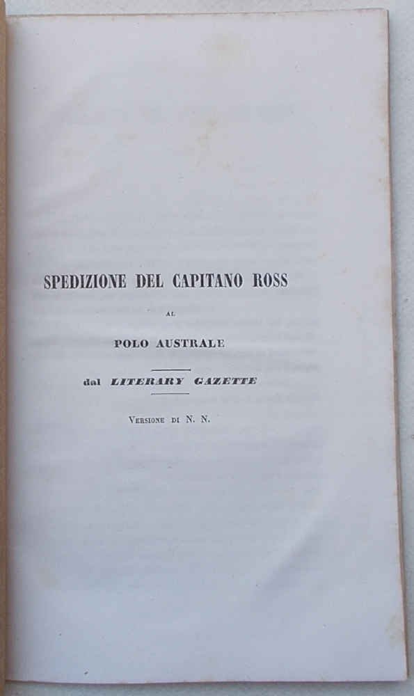 In 8° (cm. 22 x 14); pagg. 17 (numerate da 555 a 571); buona brossura muta moderna. VG. ** Versione di N.N. Stralcio tratto da "Il Mondo Contemporaneo", 1844. "I giornali inglesi ci dan notizia essere il Capitano ross dai primi giorni di settembre in quà di ritorno dallungo suo viaggio al polo antartico."
