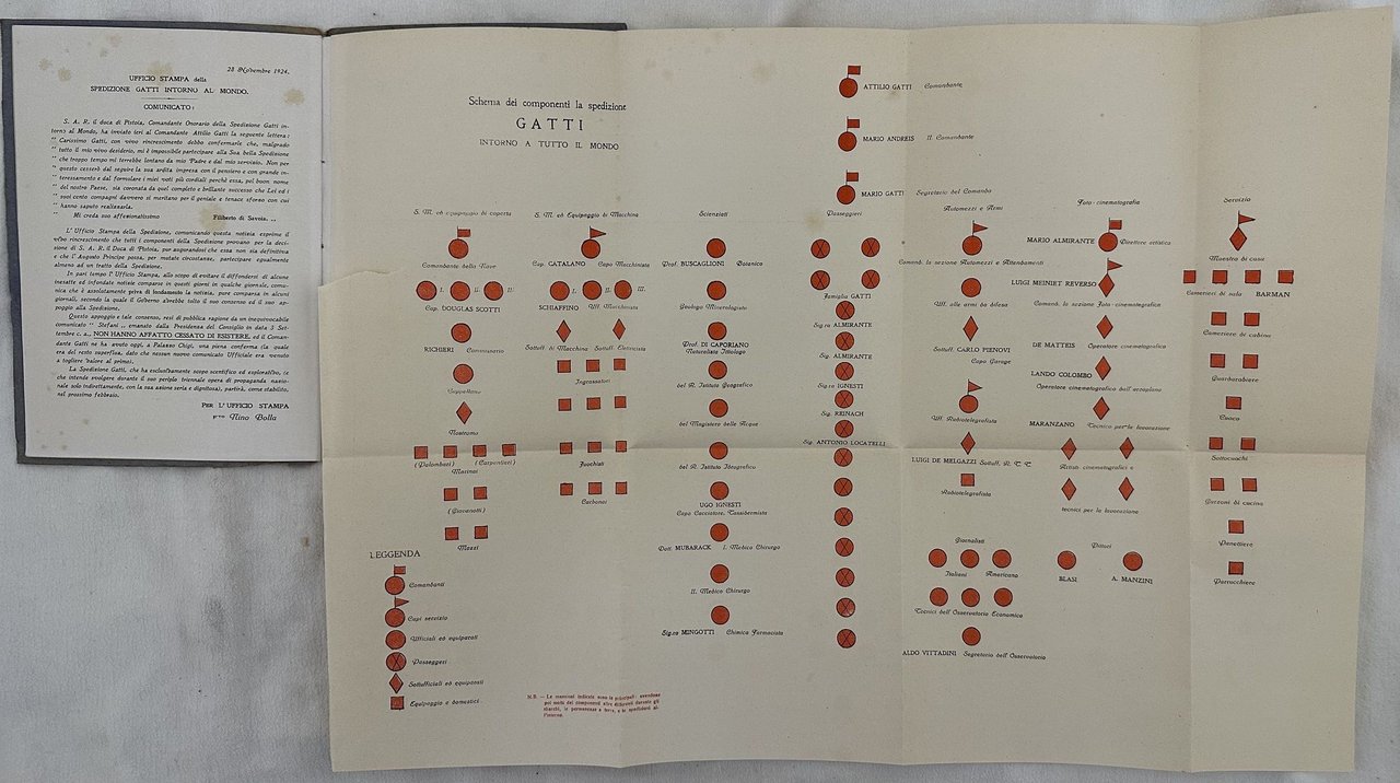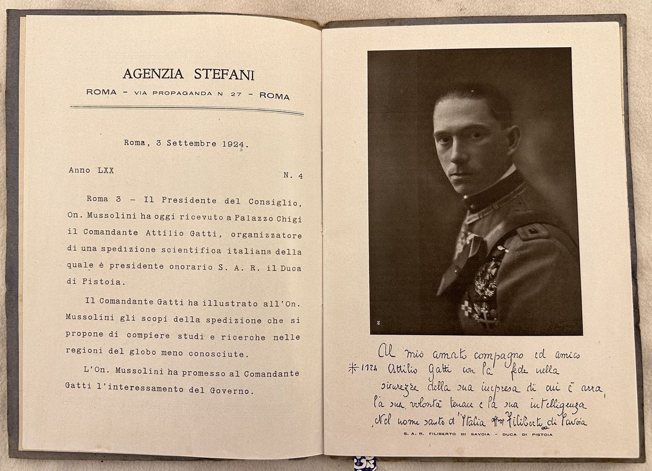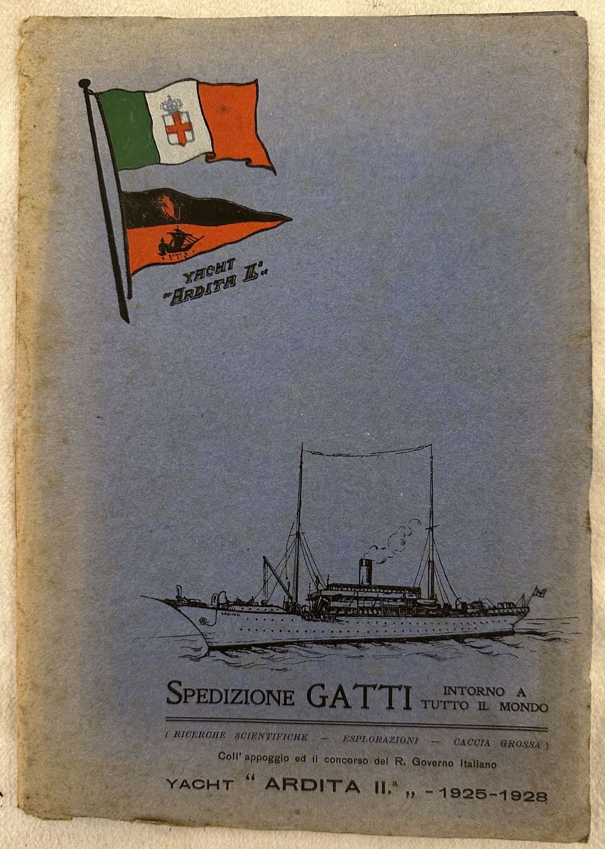 Interessante pubblicazione del 1925-28 sulla Spedizione Gatti con lo Yacht "Ardita II" per effettuare ricerche scientifiche, esplorazioni e caccia. All'interno alcune tavole fotografiche dell'equipaggio, descrizione dei fini della spedizioni, scopi che intende raggiungere, equipaggiamento della nave, sezione armi e munizioni, strumenti apparecchi e provviste, descrizione dei vari itinerari ec. Alla fine mappa ripiegata con elenco dell'equipaggio, e una tavola con le uniformi della spedizione. In buone condizioni Copertina editoriale in buone condizioni generali con lievi usure ai margini e dorso. Legatura in buone condizioni. All'interno le pagine si presentano in buone condizioni con rare fioriture. In 8. cm 21,5x15. Pp. (30).Interesting pamphlet of 1925-28 about Spedizione Gatti with Yacht "Ardita II" to make scientiphic researches, exploration and hunting. Inside some photographic plates of workers, description of expeditions, aims, weapons, instruments and food, description of routes ec. At the end folded map and a plate with uniform of guards. In good conditions. Editorial cover in good general conditions lightly worn in the extremities. Binding in good conditions. Inside pages are in good conditions with occasional foxing. In 8. cm 21,5x15. Pp. (30).