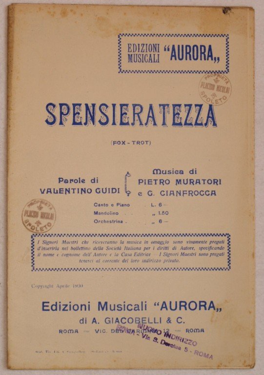 EDIZIONI MUSICALI "AURORA" DI A. GIACOBELLI & C., 1930
