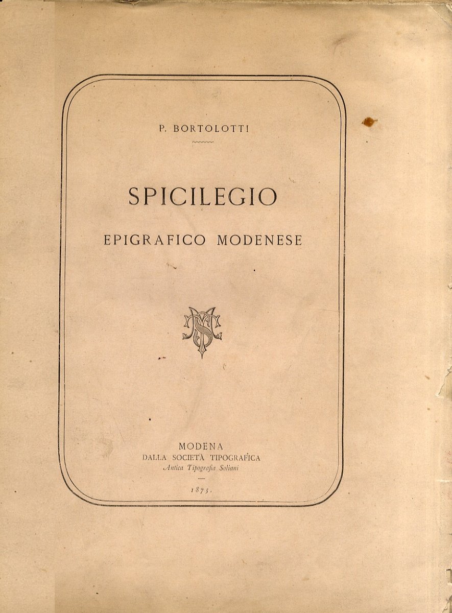 >in-folio, pp. 385,3. Brochure originale a stampa. Opera di grande approfondimento, con qualche piccola figura nel testo, costituisce il supplemento alle: "Sillogi epigrafiche cavedoniane" di Mons. Celestino Cavedoni, pubblicate nel 1862. Qualche abile restauro alla brochure, più evidente al dorso ma con solida cucitura. Ottimo stato.