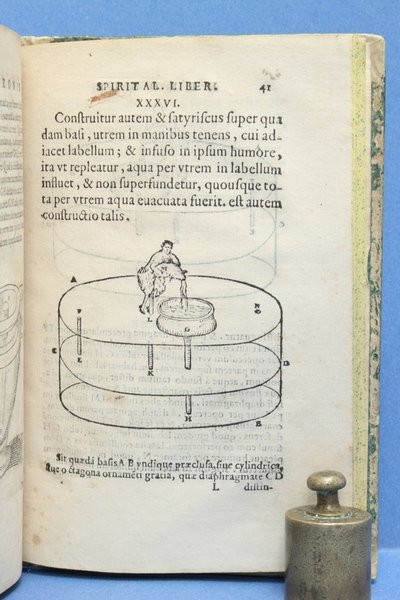 In - 4°; 2 cc., 80 cc. (mal numerate 70) con 87 incisioni xilografiche nel testo; legatura settecentesca in mezza pergamena, tassello con titolo in oro al dorso. Qualche macchiolina e brunitura. Prima edizione assoluta degli Spiritali (o Pneumatica), opera maggiore di Erone di Alessandria. La versione latina è di Federico Commandino, l'edizione del testo greco vedrà la luce solo nel 1693. Il testo è ampiamente illustrato da interessanti xilografie che raffigurano macchine, meccanismi, fontane, giochi ed esperimenti azionati dalla pressione dell'acqua, del vapore e del vento. Erone, matematico e inventore di Alessandria vissuto con tutta probabilità nel I sec. d.C. e le cui opere sono pervenute tramite la mediazione araba, propose meccanismi e invenzioni ammirate da tutti gli ingegneri del Rinascimento. Tra le macchine descritte e illustrate, particolarmente curiose sono la fontana detta di Erone, che zampilla grazie alla pressione dell'acqua, o la eolipila (o sfera di Eolo), che rappresenta il primo tentativo di trasformare il vapore in energia meccanica (si tratta della prima turbina a vapore della storia) o ancora un dispositivo (basato sulla dilatazione dell'aria) per far aprire le porte del tempio all'accensione del fuoco sull'altare. Riccardi I, 364. Mortimer, Italian Books I, 230. Caillet 5117. Poggendorff I, 469. Hoffmann II, 357. Honeyman 1652.