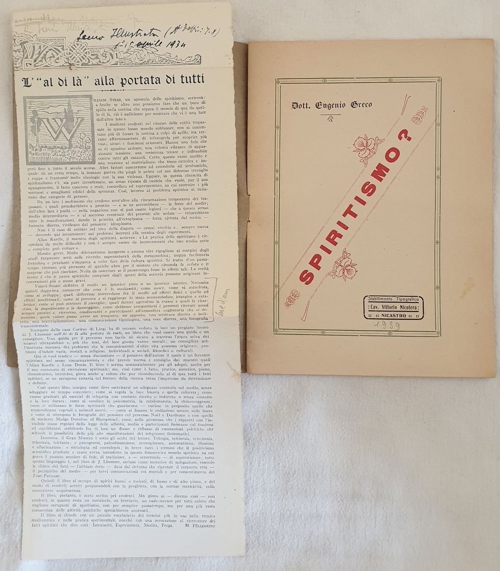 Interessante pubblicazione del 1939 sullo spiritismo scritto da Eugenio Greco. L'autore indaga alcuni fenomeni di spiritismo come le sedute, il medium e il trance cercando di fornire una spiegazione scientifica. Cita alcuni autori: Ferè, Brown-Sequard, Arsondal, Gabriele Delanne, Bottazzi. Insieme alla pubblicazione un articolo "L'Al di Là" alla portata di tutti di M. Pellegrino tratto dalla Scena Illustrata numero del 1-15 aprile 1934. Note manoscritte. In buone condizioni. Copertina editoriale in buone condizioni con lievi usure. Legatura in buone condizioni. Pagine in buone condizioni con rare fioriture. Mancanza a pag. 5 con perdita di testo. In 8. cm 21,5x15,5. Pp. 14. Interesting pamphlet of 1939 about spiritism by Eugenio Greco. The author describes some phenomena of spiritsm as sedute, medium, trance trying to provide a scientiphic explanation. Some authors: Ferè, Brown-Sequard, Arsondal, Gabriele Delanne, Bottazzi. Together with the pamphlet an article "L'Al di Là" alla portata di tutti by M. Pellegrino taken from Scena Illustrata number of 1-15 of april 1934. Handwritten notes. In good conditions. Editorial cover in good conditions lightly worn in the extremities. Binding in good conditions. Inside pages are in good conditions with occasional foxing. Lacking in pag. 5 with loss of text. In 8. cm 21,5x15,5. Pp. 14.