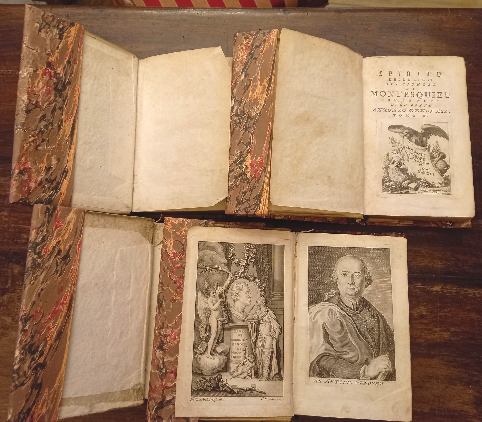 In-8 (19 cm) 4 voll. (2) c. (tavole) (1) c.(frontespizio con vignetta calcografata) (38) CX 377 (1); XXXVI 431 (1); XXXII 415 (1). Cartonato con pochi resti di pergamena, ricoperto da carta Fabriano con decorazione marmorizzata a mano. Sui frontespizi marca calcografica sottoscritta C. Pignatari inc.: Aquila che sorregge una pelle di leone su cui è scritto: Domenico Terres negoziante di libri Napoli, con leone, libri, mappamondo e alloro.Il colophon compare solo in fine al vol. I. Genovesi Antonio (1713-1769): Abate; filosofo; economista; professore universitario di metafisica e di etica; storico; scrittore di agricoltura; memorialista; scrittore di testi scolastici. Il primo volume contiene il ritratto calcografico calcografico dell'autore inciso da Benedetto Cimarelli. Antiporta disegnata da Francesco Viva e incisa da Carmine Pignataro e Elogio del sig. presidente di Montesquieu, e Analisi dello Spirito delle leggi del sig. d'Alembert per servire di continuazione all'Elogio del sig. di Montesquieu.Il tomo IV contiene anche: Difesa dello Spirito delle leggi. Alla quale sono aggiunte alcune dilucidazioni, Ringraziamento sincero ad un uomo caritatevole. Attribuito a M. de Voltaire, e Lisimaco. In-8 (19 cm) 4 vols. (2) c. (tables) (1) c. (title page with chalcographed vignette) (38) CX 377 (1); XXXVI 431 (1); XXXII 415 (1). Hardback with a few remains of parchment, covered with Fabriano paper with hand-marbled decoration. On the title pages chalcographic brand signed C. Pignatari inc .: Eagle holding a lion's skin on which is written: Domenico Terres book dealer Naples, with lion, books, globe and laurel. The colophon appears only at the end of vol. I. Genovesi Antonio (1713-1769): Abbot; philosopher; economist; university professor of metaphysics and ethics; historical; agriculture writer; memorialist; writer of school texts. The first volume contains the chalcographic portrait of the author engraved by Benedetto Cimarelli. Front door designed by Francesco Viva and engraved by Carmine Pignataro and Elogio del sig. president of Montesquieu, and Analysis of the Spirit of the laws of Mr. d'Alembert to serve as a continuation of Mr. Montesquieu. Volume IV also contains: Defense of the Spirit of the Laws. To which are added some clarifications, Sincere thanks to a charitable man. Attributed to M. de Voltaire, and Lisimaco.