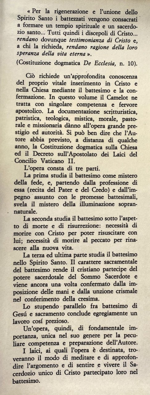 Un'opera, quindi, di fondamentale importanza, unica nel suo genere per la peculiare competenza e preparazione dell'Autore. I laici, ai quali l'opera è destinata, troveranno il modo di meditare e di approfondire l'argomento e di sentire e vivere il Sacerdozio unico di Cristo partecipato loro nel battesimo.