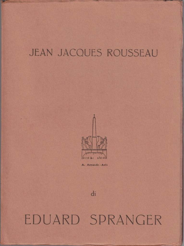 Eduard Spranger, Jean Jacques Rousseau ed altri saggi, traduzione di Luigi Gallinari, Avio Armando Armando Editore, Roma 1958, pp. 85, cm 20, br. ed. Collana I problemi della pedagogia, vol. 27. Titolo originale: Jean Jacques Rousseau. Die erziehung der frau zur erzieherin. Eros. Von der ewigen Renaissance. Indice: Gian Giacomo Rousseau – L’eterno Rinascimento – L’educazione della donna come educatrice – Eros. Minime tracce d’uso alla brossura, sporadiche fioriture, lieve brunitura della carta, per il resto perfetto. Intonso.
