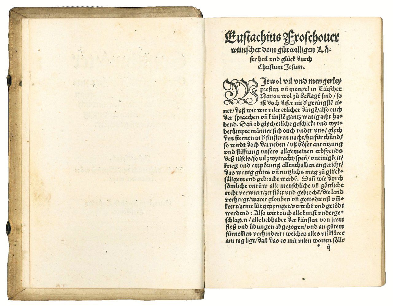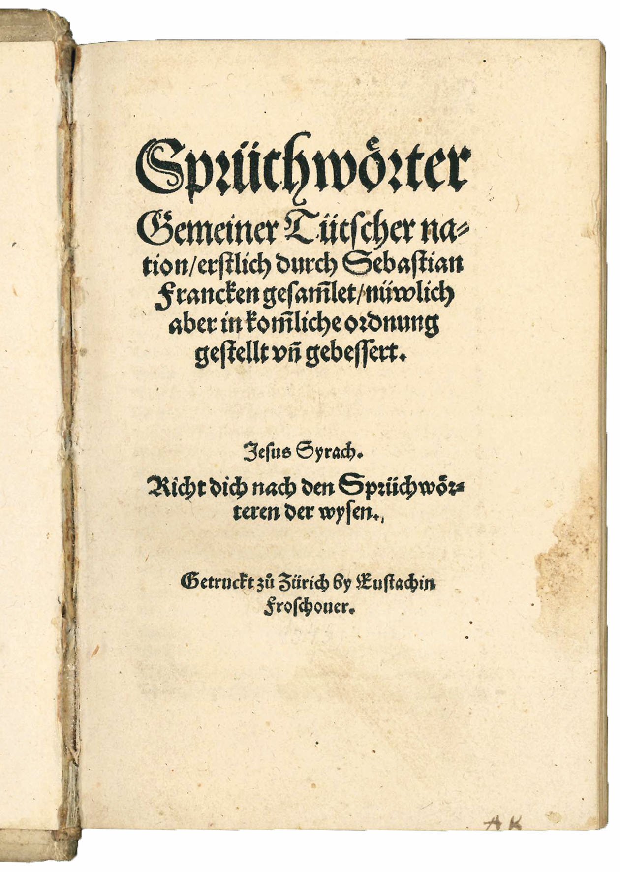 “Die folkloristisch bedeutende Sprichwörtersammlung Sebastian Francks, die erstmals 1541 bei Egenolf zu Frankfurt erschienen war, gab Froschauer 1545 in durch Konrad Pellikan ausgearbeiteter Neuordnung heraus (Rud. 318). Als Drucker und Verleger zeichnet Christophs Bruder Eustachius, der dem umfangreichen Oktavbande eine Vorrede vorausschickte” (P. Leemann-Van Elck, Die Offizin Froschauer, Zurich-Leipzig, 1940, p. 92).